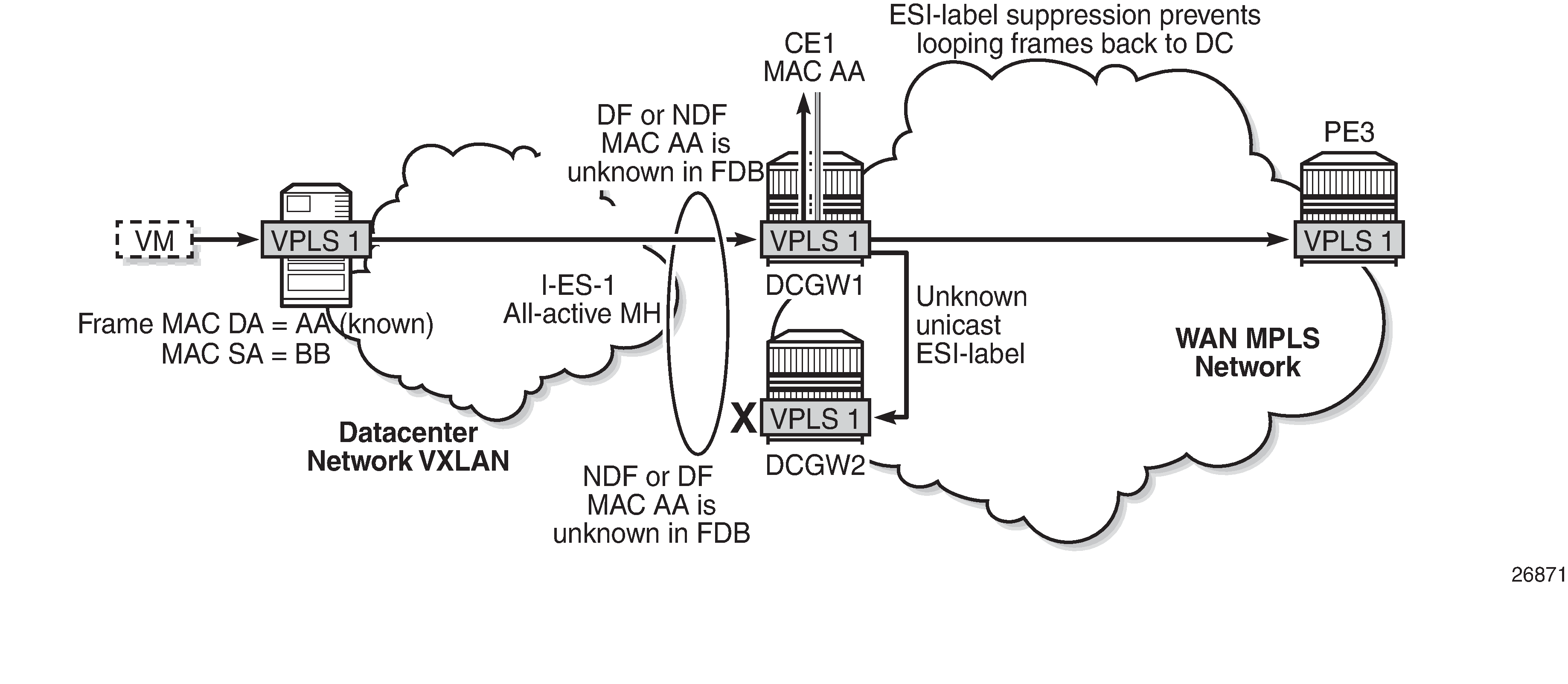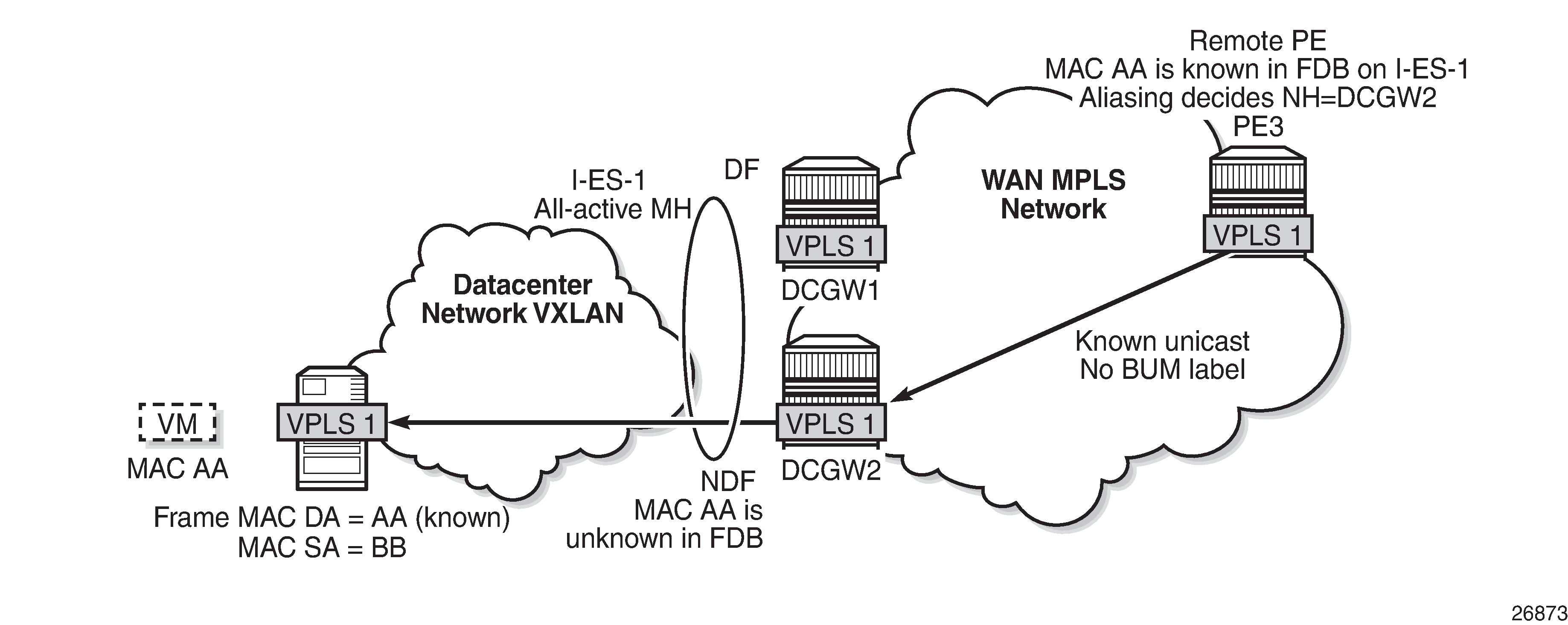 PE3 receives unicast traffic with MAC DA = AA. The MAC address is known in the FDB and associated with I-ES-1; therefore, because PE3 is configured to do aliasing to DCGW1 and DCGW2 (bgp-evpn>mpls# ecmp 2), a packet hash determines that it has to be sent to DCGW2 (NDF). The packet arrives at DCGW2 with a unicast label. DCGW2 does a lookup and MAC AA is unknown for some reason (such as FDB limit exceeded, MAC not learned yet, and so on). In this case, DCGW2 will forward the packet to the I-ES VXLAN bindings, even if it is NDF. This behavior avoids black-hole periods in the network for unicast traffic.