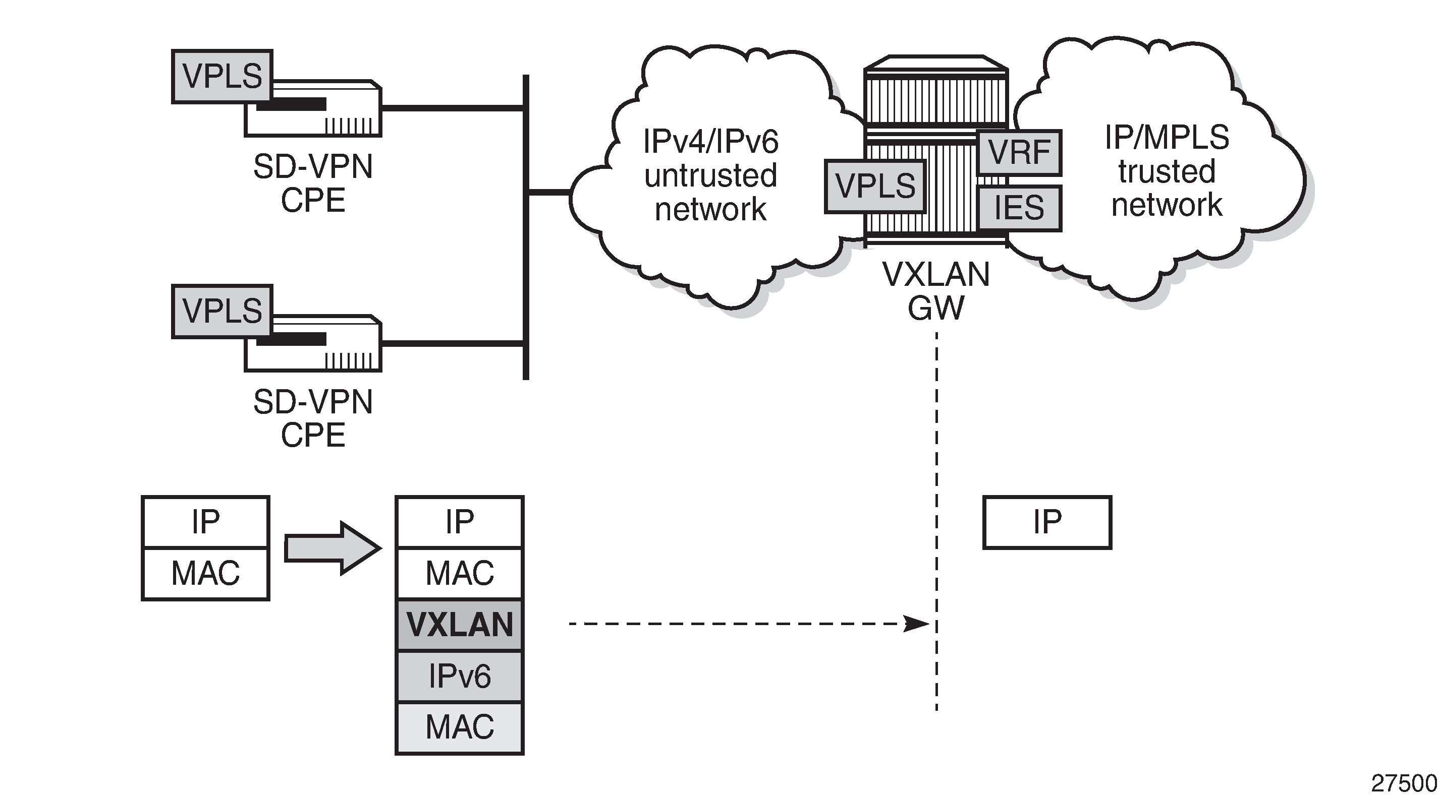 Traffic transported on a VXLAN is usually connected to a trusted environment through a VPRN running in a private IP/MPLS network. The VXLAN GW system IP address is used for all internal management and MPLS termination in the trusted network. However, in this use case, SR OS routers are expected to be used as a VXLAN GW in SD-VPNs where the VXLAN GW terminates untrusted VXLAN tunnels initiated on the SD-VPN CPEs and forwards packets to a trusted IP/MPLS network, as shown in VXLAN GW in an SD-VPN.