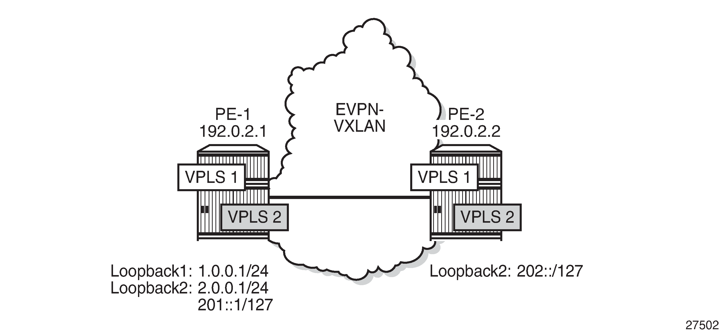 Example topology for VXLAN FPE shows the example topology with two PEs in an EVPN-VXLAN network. The loopback addresses in the base router will be used for non-system IP VXLAN termination.