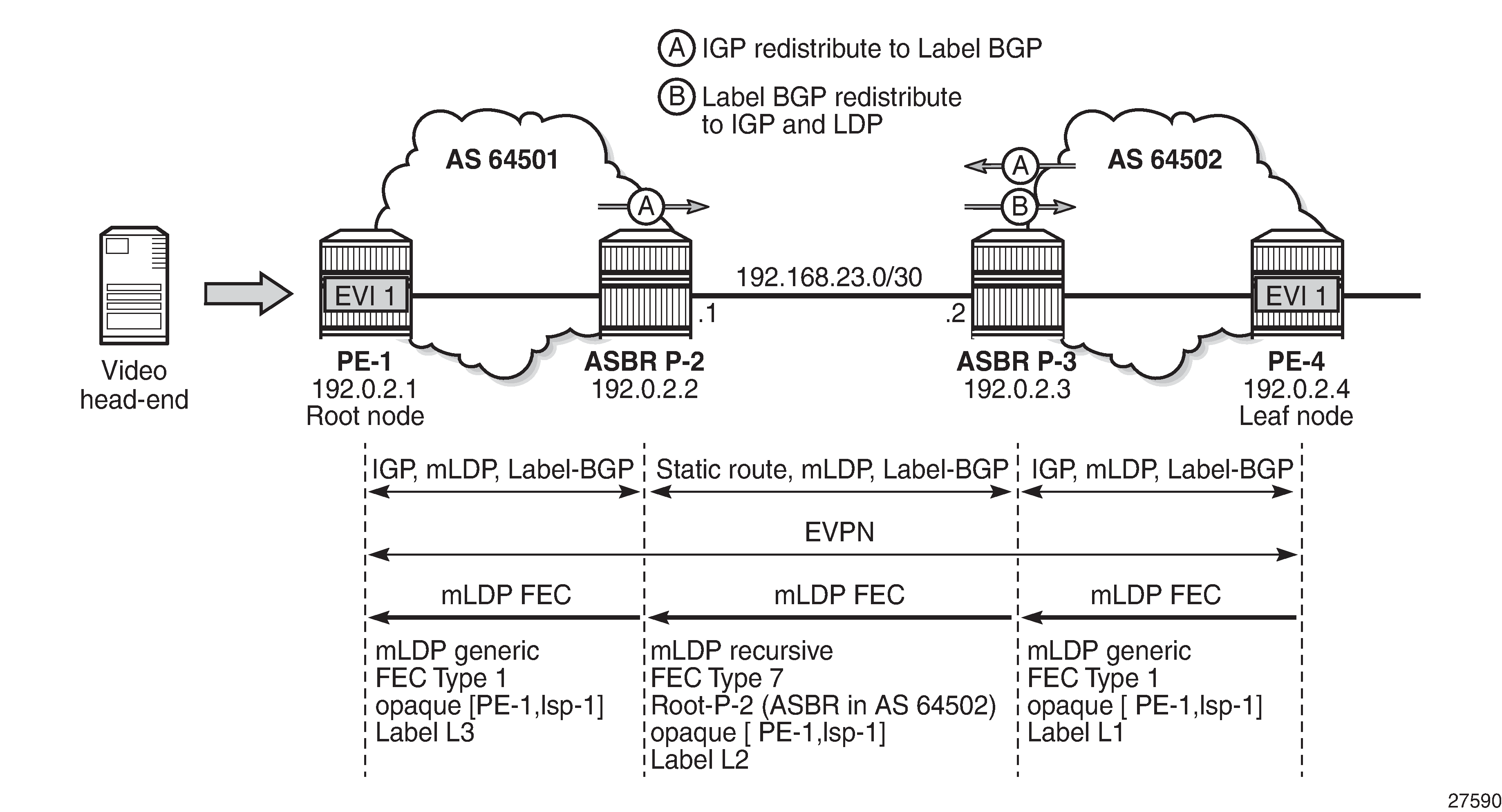 Point-to-Multipoint Multicast Label Distribution Protocol (P2MP mLDP) for Broadcast, Unknown Unicast, and Multicast (BUM) traffic in EVPN-MPLS networks is supported in SR OS Release 14.0.R1, and later. EVPN with P2MP mLDP LSPs is supported in a seamless MPLS or inter-AS model C scenario in SR OS Release 15.0.R1, and later. This chapter describes the inter-AS model C scenario, but the configuration for seamless MPLS is similar.