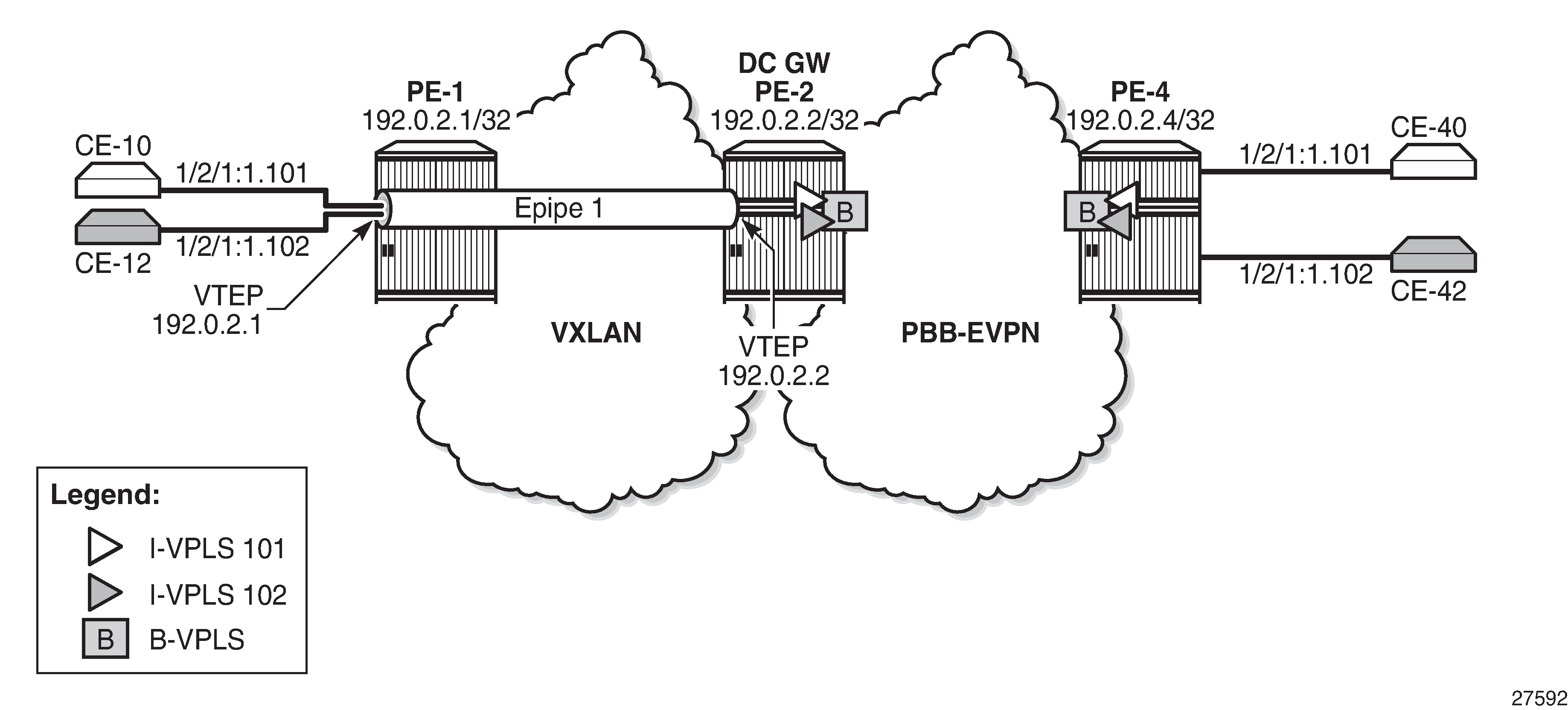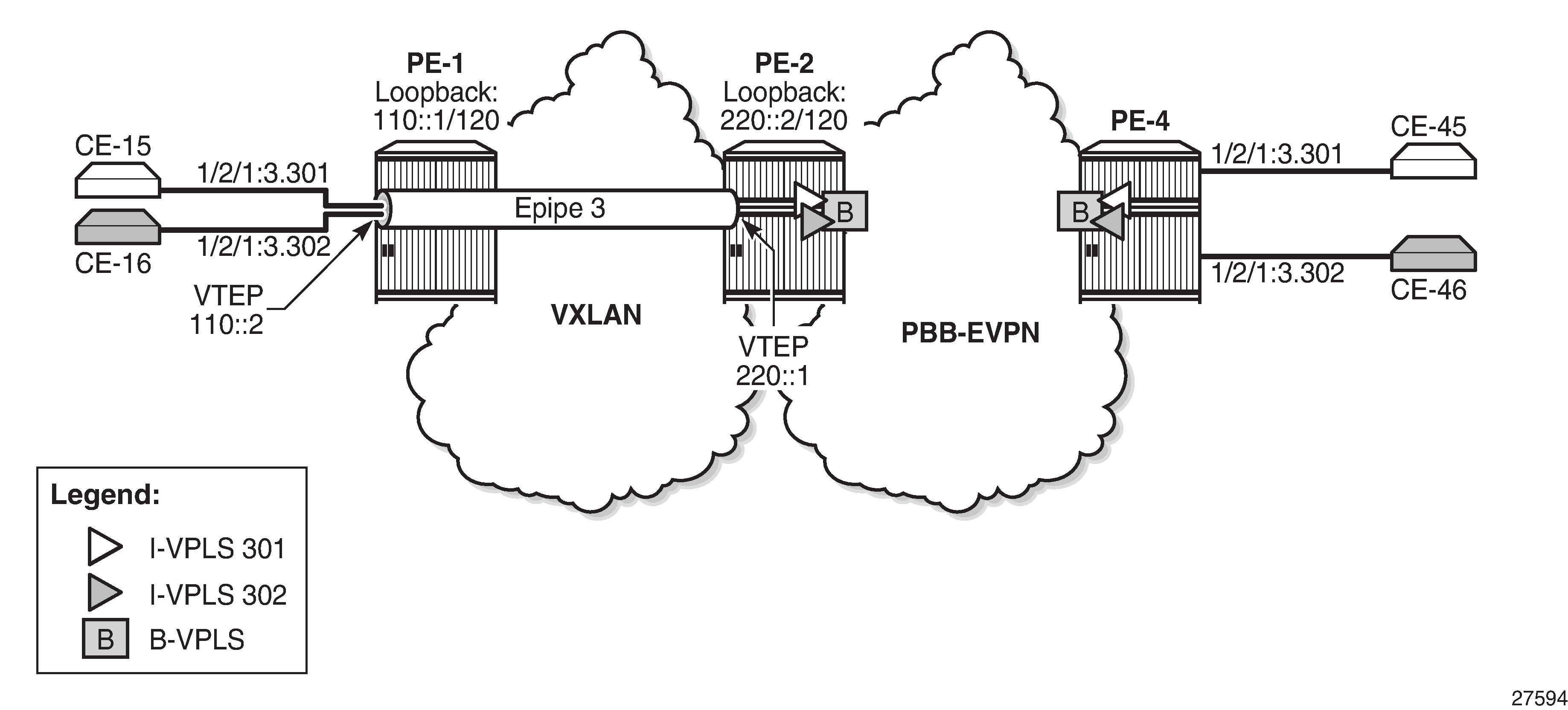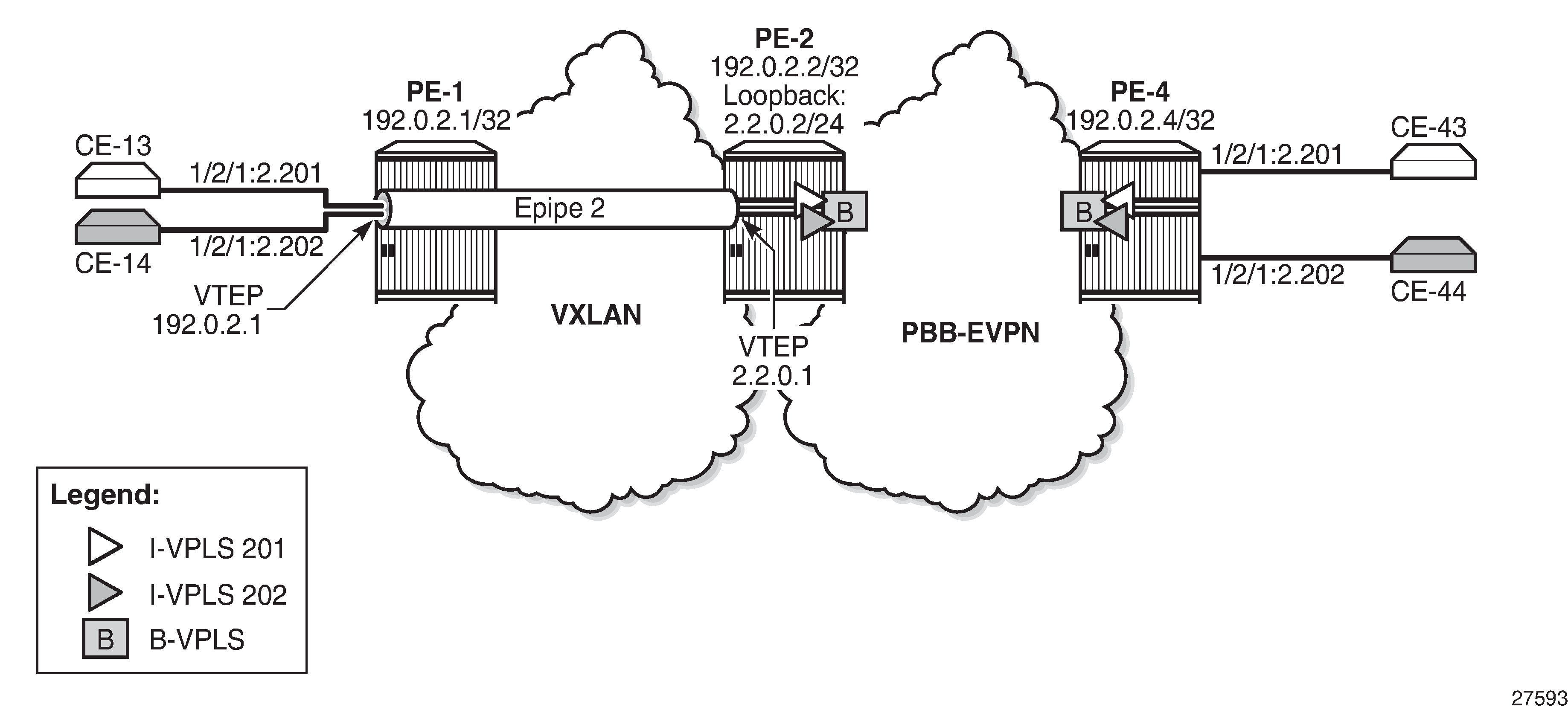 VXLAN FPE is required to terminate non-system IPv4/IPv6 VXLAN tunnels. The examples in this chapter show how VXLAN FPE can be applied in Epipe services, to stitch static VXLAN to other services, such as I-VPLS services.