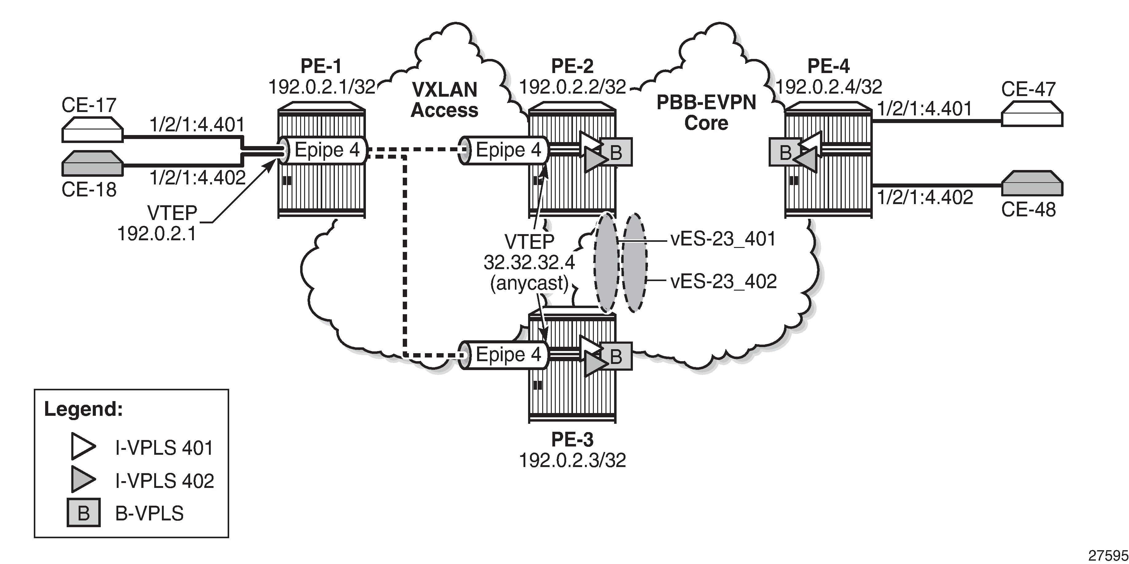 The following FDB for B-VPLS 100 on PE-4 contains the BMAC addresses of PE-2 and PE-3, but also the BMAC addresses of vES-23_401 and vES-23_402: