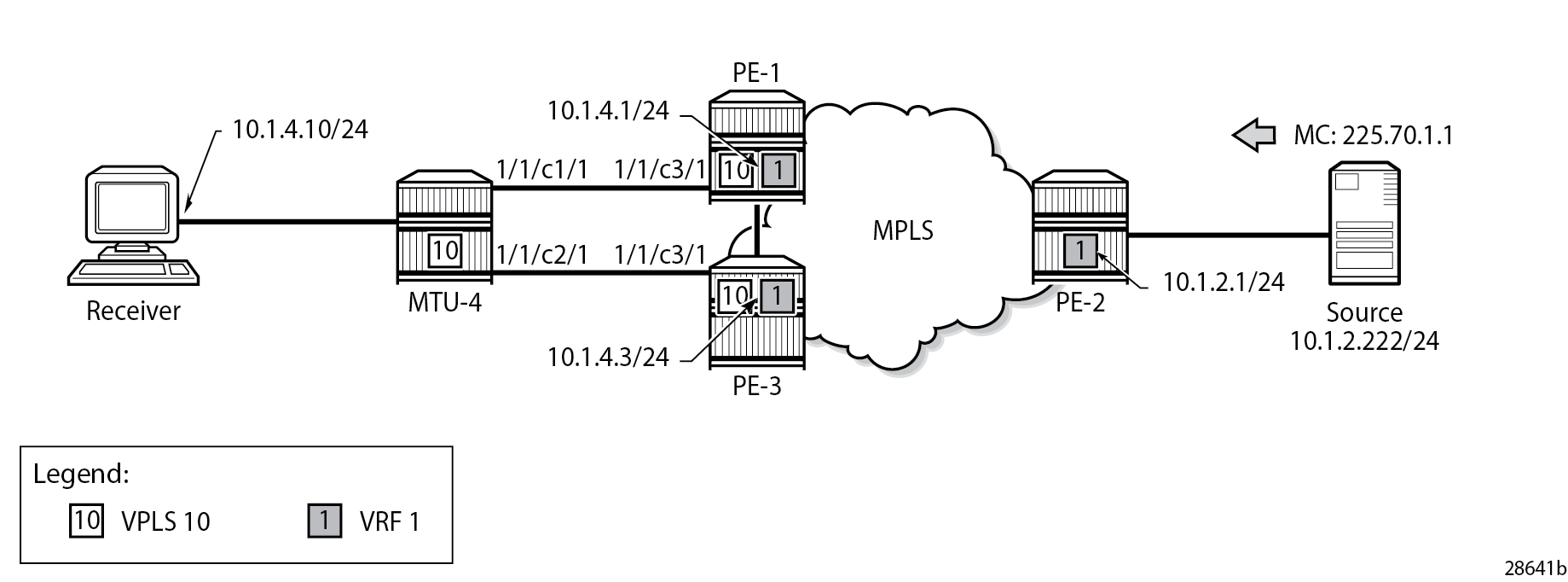 A multicast stream is emitted by the source connected to PE-2 with group address 225.70.1.1. A multicast receiver connected to MTU-4 joins group 225.70.1.1. MTU-4 is connected to PE-1 and PE-3 through an all-active multi-homing EVPN Ethernet segment comprising LAG 1. On MTU-4, LAG 1 comprises port 1/1/c1/1 and 1/1/c2/1, and this LAG is used in VPLS 10. On PE-1 and PE-3, VPLS 10 is interconnected with VPRN 1 through an Integrated Routing and Bridging (IRB) interface. VPRN 1 is defined in PE-1, PE-2, and PE-3, and uses NG-MVPN for transporting the multicast traffic through the core of the network. See the EVPN for MPLS Tunnels and EVPN for MPLS Tunnels in Routed VPLS chapters for more information about EVPN. See the "NG-MVPN Configuration with MPLS" and "NG-MVPN Configuration with PIM" chapters in the 7450 ESS, 7750 SR, 7950 XRS, and VSR Layer 3 Services Advanced Configuration Guide for MD CLI for more information about NG-MVPN.