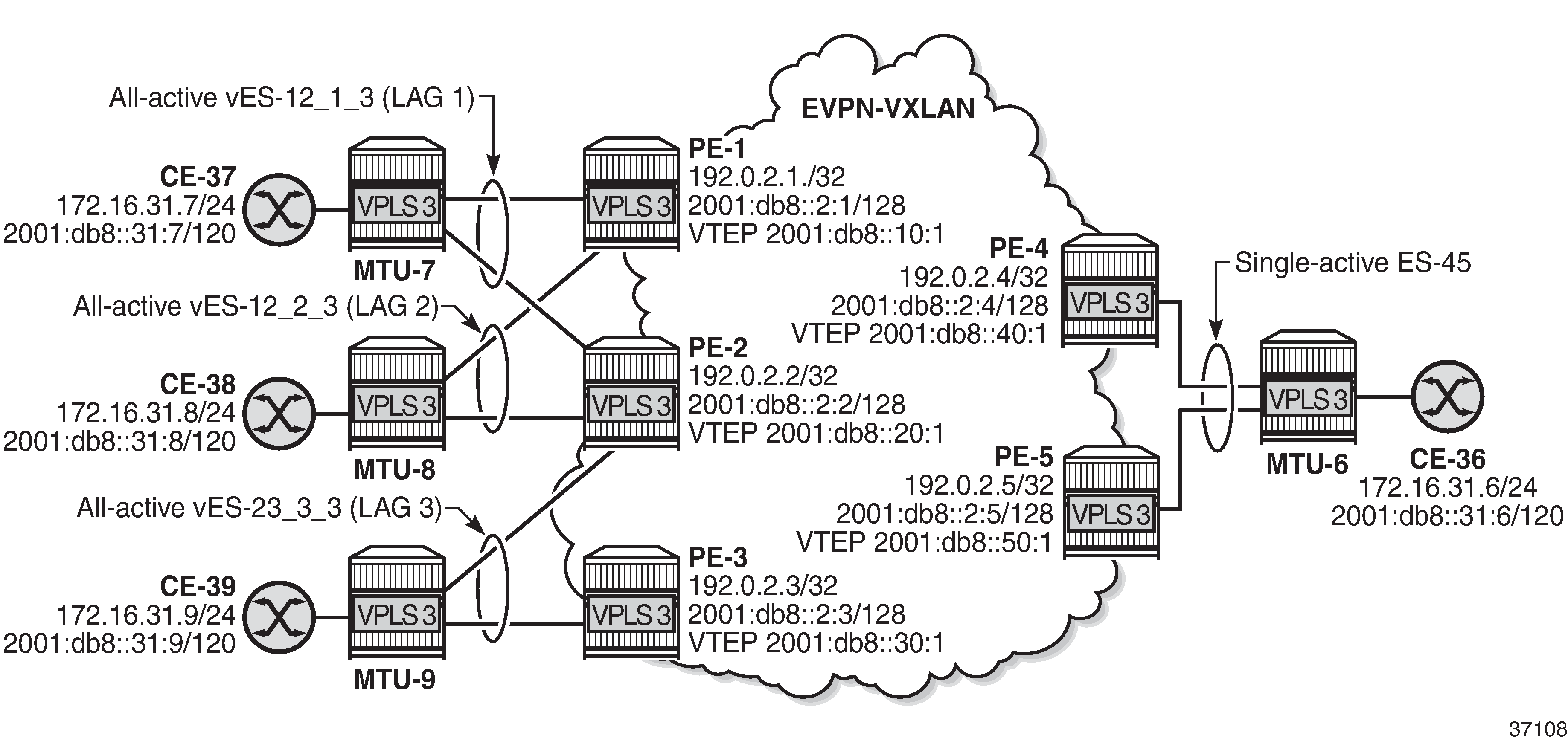Example topology shows the topology with three all-active multi-homing ESs and one single-active multi-homing ES. This example shows the configuration for virtual Ethernet Segments, as described in the Virtual Ethernet Segments chapter, but non-virtual ES can also be used.
