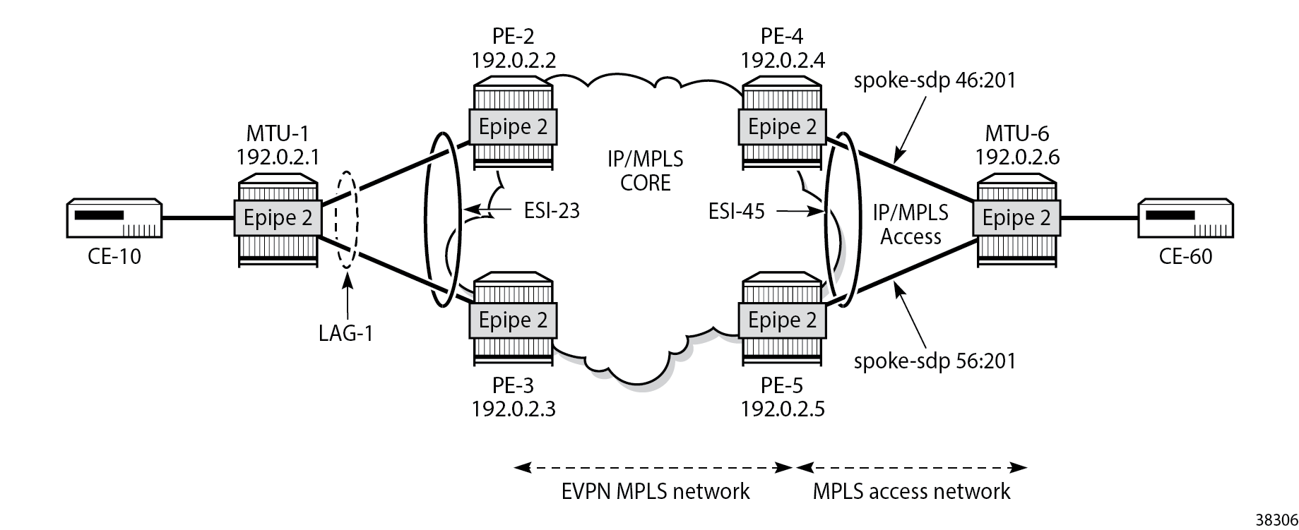 BGP-EVPN can be enabled in Epipe services with either SAPs or spoke SDPs at the access, as shown in Example topology for EVPN-VPWS without multihoming.