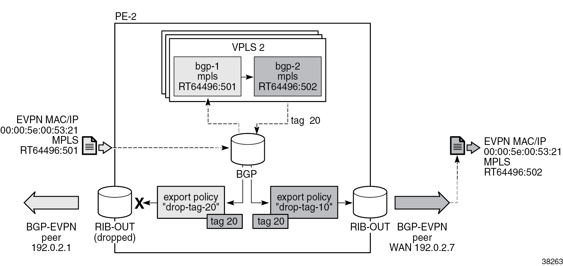 In datacenter GWs (DC GWs) with EVPN-VXLAN and EVPN-MPLS instances, route policies can match on the encapsulation type VXLAN or MPLS. In DC GWs with two EVPN-MPLS instances, the default route tag is used instead. The default route tag prevents a MAC/IP route that is installed in instance 1 (access) from being readvertised back to the access peers. In a similar way, MAC/IP routes installed in instance 2 are not readvertised back to peers in instance 2. On PE-2 and PE-3, the BGP peer export policy "drop-tag-10" drops routes with tag 10 and is configured in BGP group "WAN" with neighbor RR-7; BGP peer export policy "drop-tag-20" drops routes with tag 20 and is configured in BGP group "access1" with neighbor PE-1.