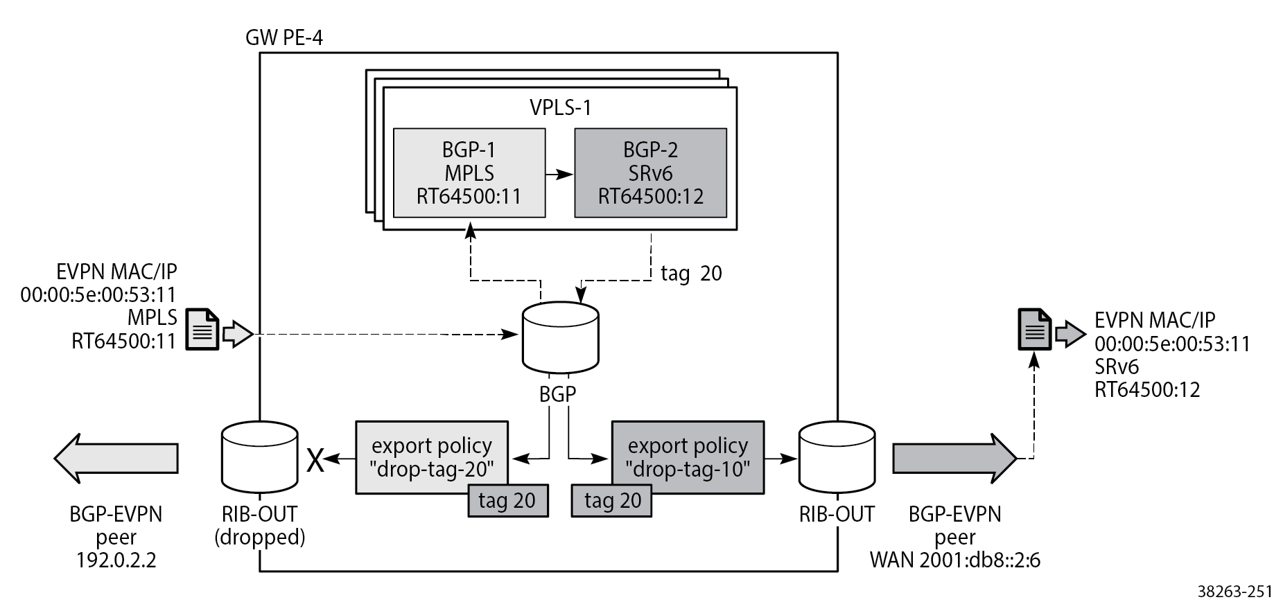 The figure shows that an incoming MAC/IP route with RT 64500:11 is accepted in VPLS-1 on GW PE-4 by service instance 1 and passed on to service instance 2 where it gets RT 64500:12 and default route tag 20. Routes with route tag 20 are accepted for routes sent to peer 2001:db8::2:6 in the network, but not for routes sent back to access peer 192.0.2.2. Likewise (but not shown in the figure), routes coming from peer 2001:db8::2:6 with RT 64500:12 are accepted by service instance 2 and passed on to service instance 1 where default route tag 10 is added. Routes with route tag 10 are forwarded to peer 192.0.2.2, but are not sent back to the network peer 2001:db8::2:6.