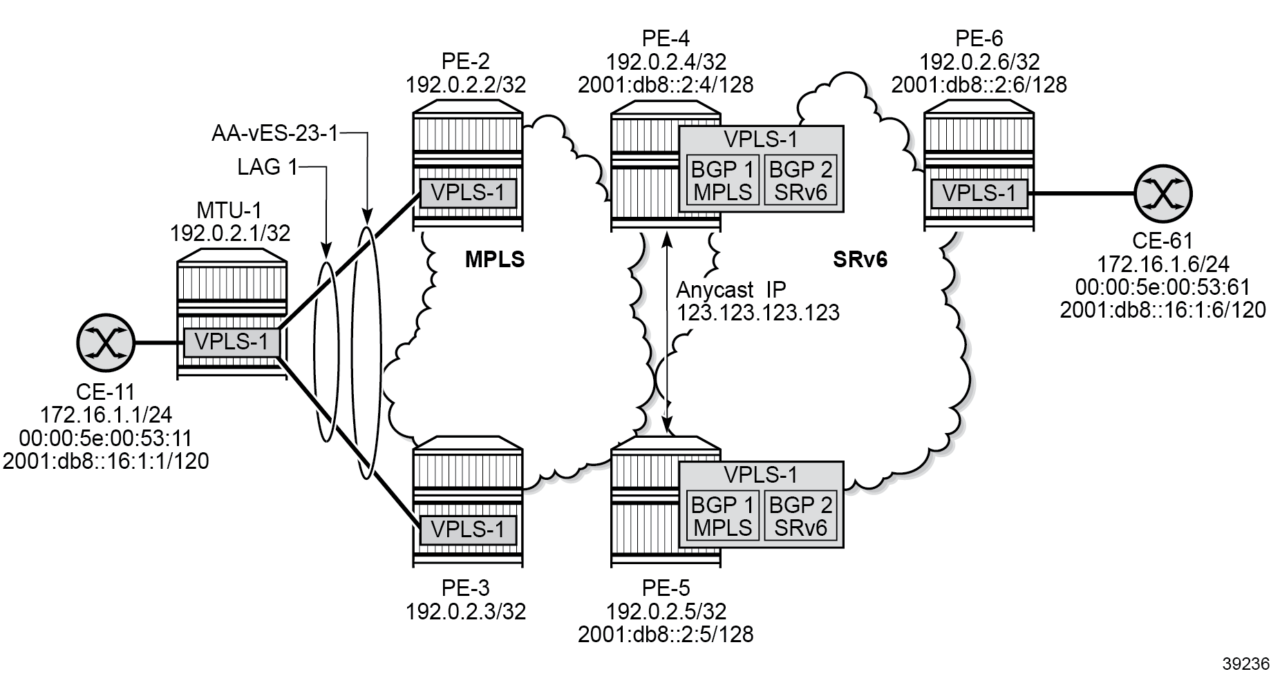 - two mh-mode access instances in the same EVPN VPLS are allowed for the combinations VXLAN/MPLS, VXLAN/SRv6, and MPLS/SRv6 (but not for the combination MPLS/MPLS)