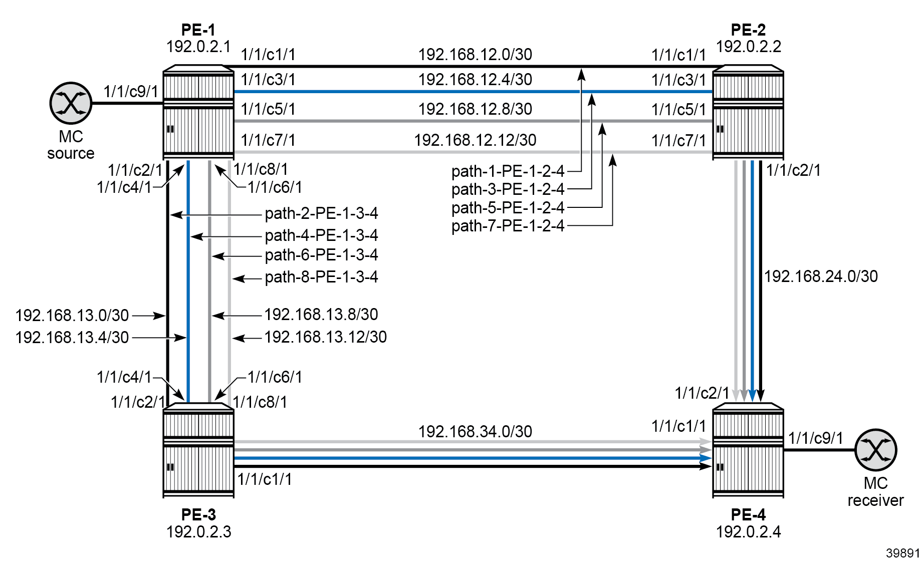 To allow multiple different MPLS paths from PE-1 to PE-4, four router interfaces are configured between PE-1 and PE-2, and between PE-1 and PE-3.