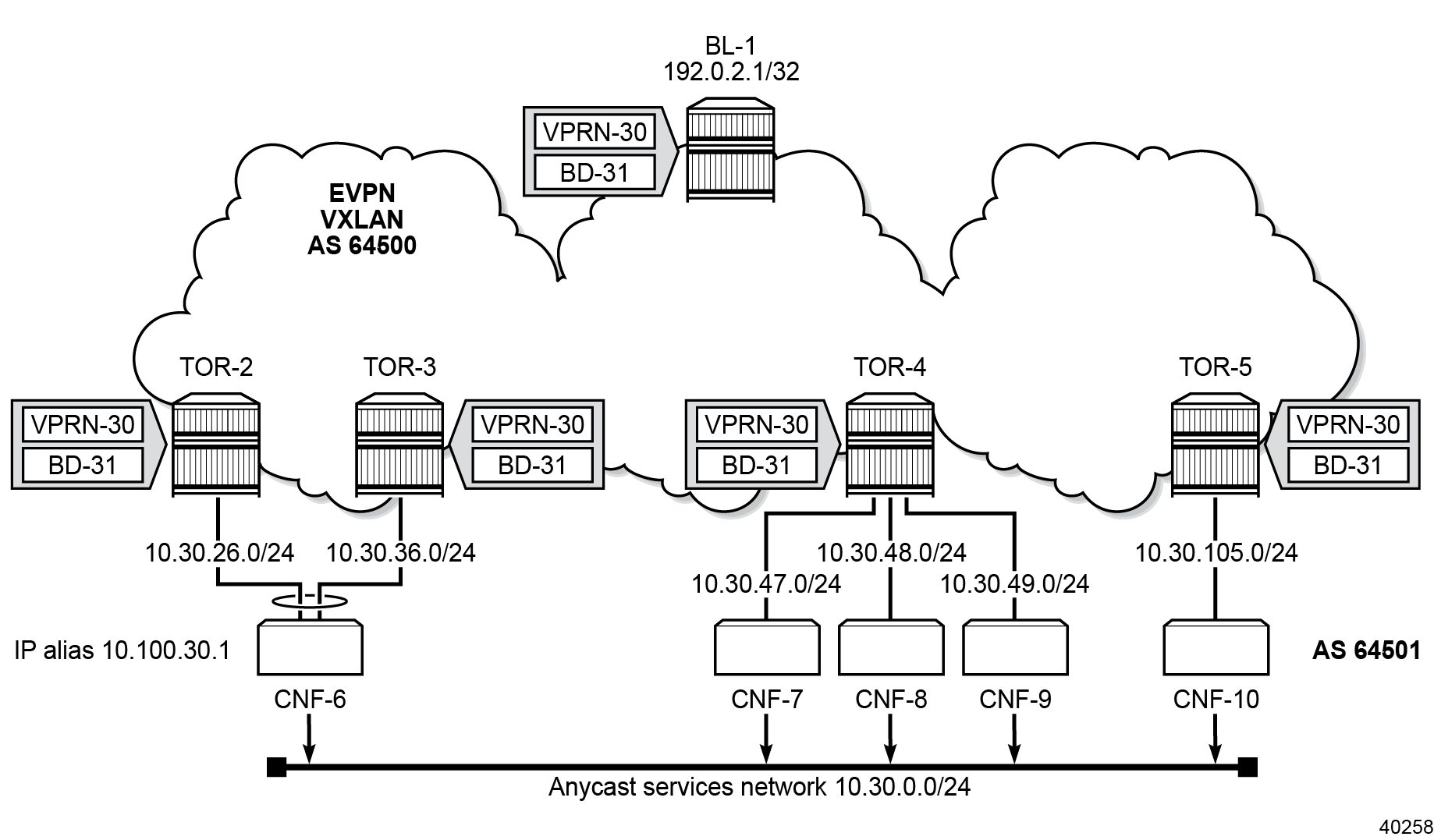 - IBGP between route reflector (RR) BL-1 and each TOR for the EVPN address family