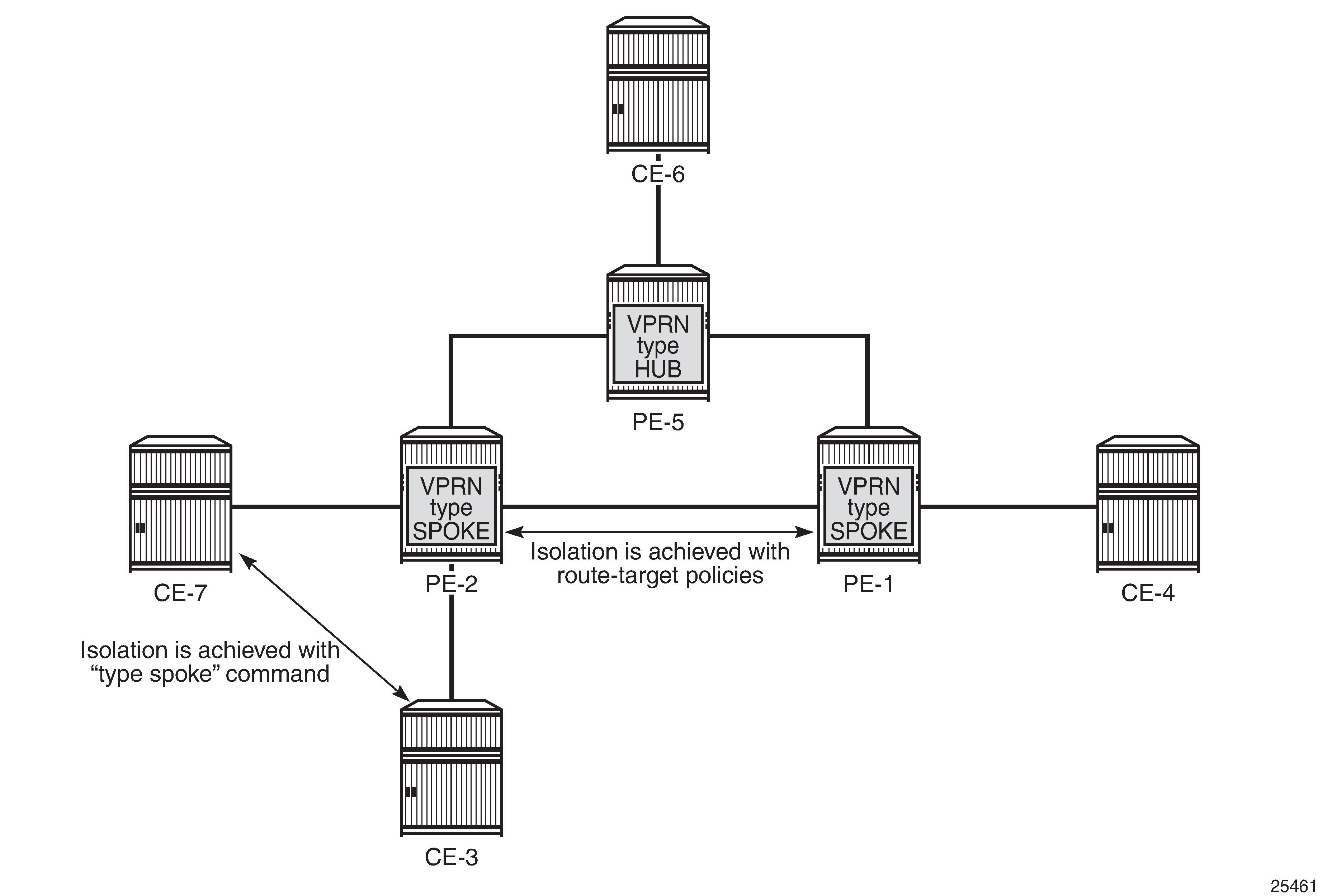 The only way for CE-7 to communicate with CE-3 is via hub site CE-6. The same applies to the communication between CE-7 and CE-4. The VPRN on PE-2 is configured as type spoke and has IP interfaces using SAPs or spoke SDPs that are considered spoke sites only. No direct communication between any of the spoke CE sites in the network is allowed.
