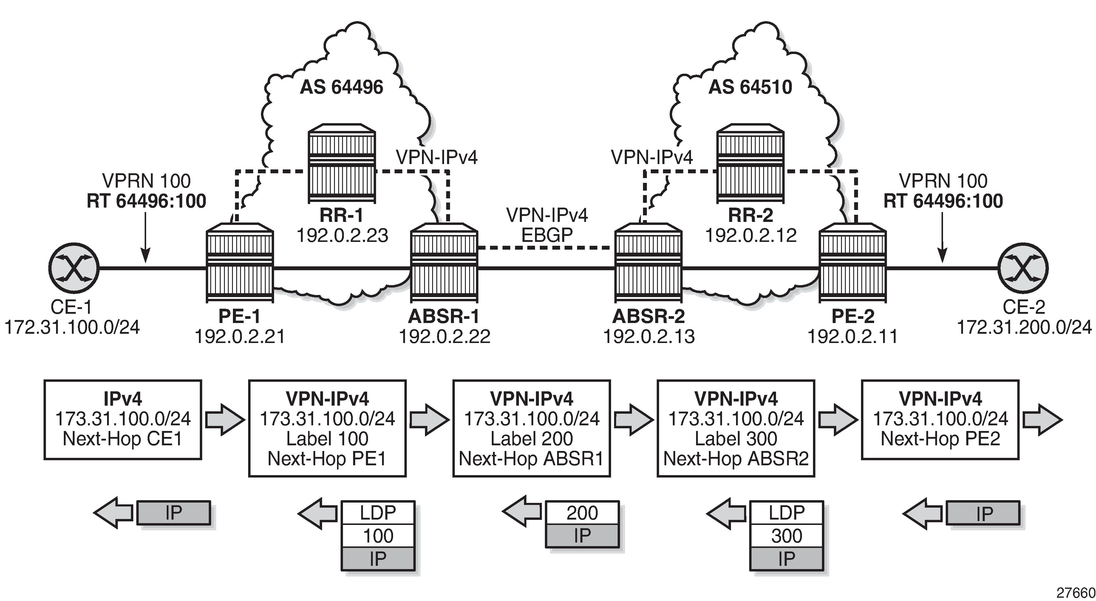 Inter-AS VPRN Model B control and data plane example shows an example of the control plane and corresponding data plane used in model B, where MPLS is used for transport in both ASs. CE-1 is attached to PE-1 in AS 64496 and advertises prefix 172.31.100.0/24, which is propagated between neighboring ASBRs to PE-2 in AS 64510 and upstream to CE-2.