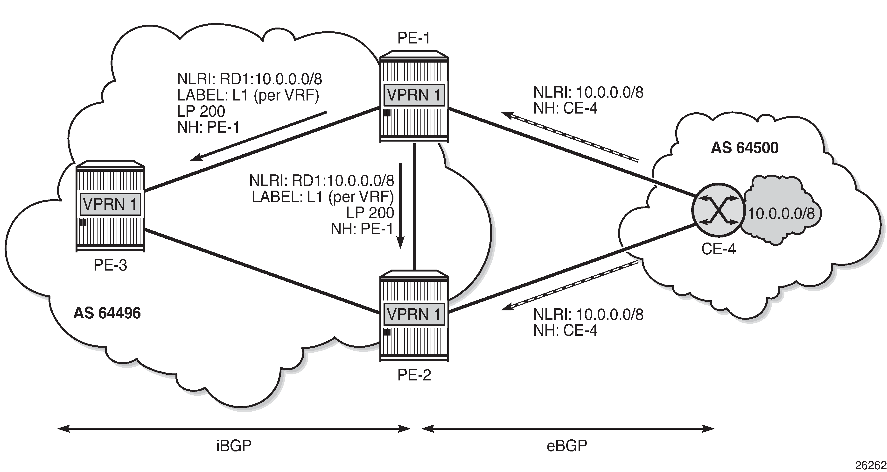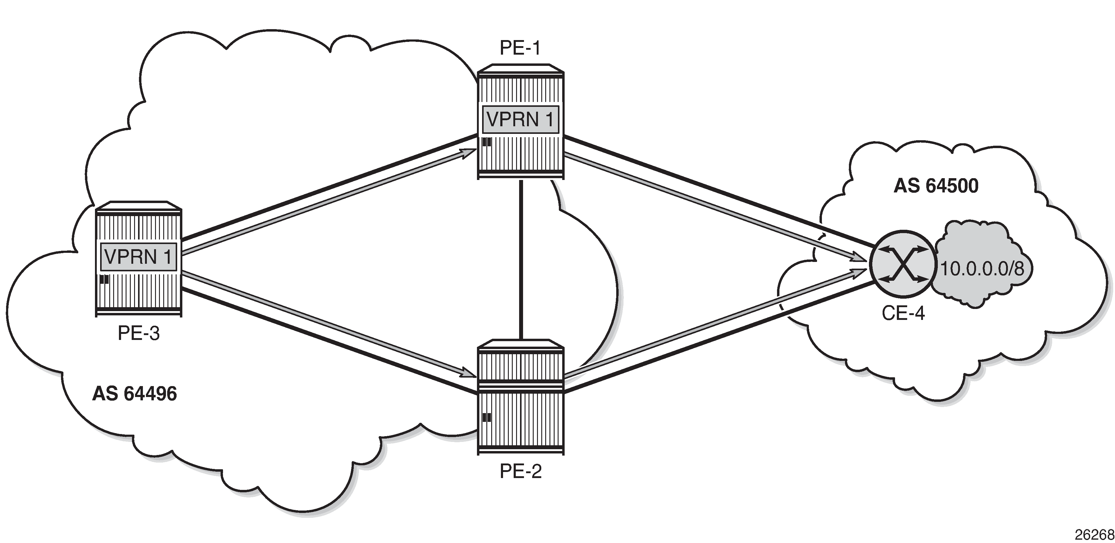 CE-4 advertises prefix 10.0.0.0/8 to its EBGP peers PE-1 and PE-2 shows the example topology with CE-4 in Autonomous System (AS) 64500 advertising prefix 10.0.0.0/8 to VPRN 1 in PE-1 and PE-2 in AS 64496.