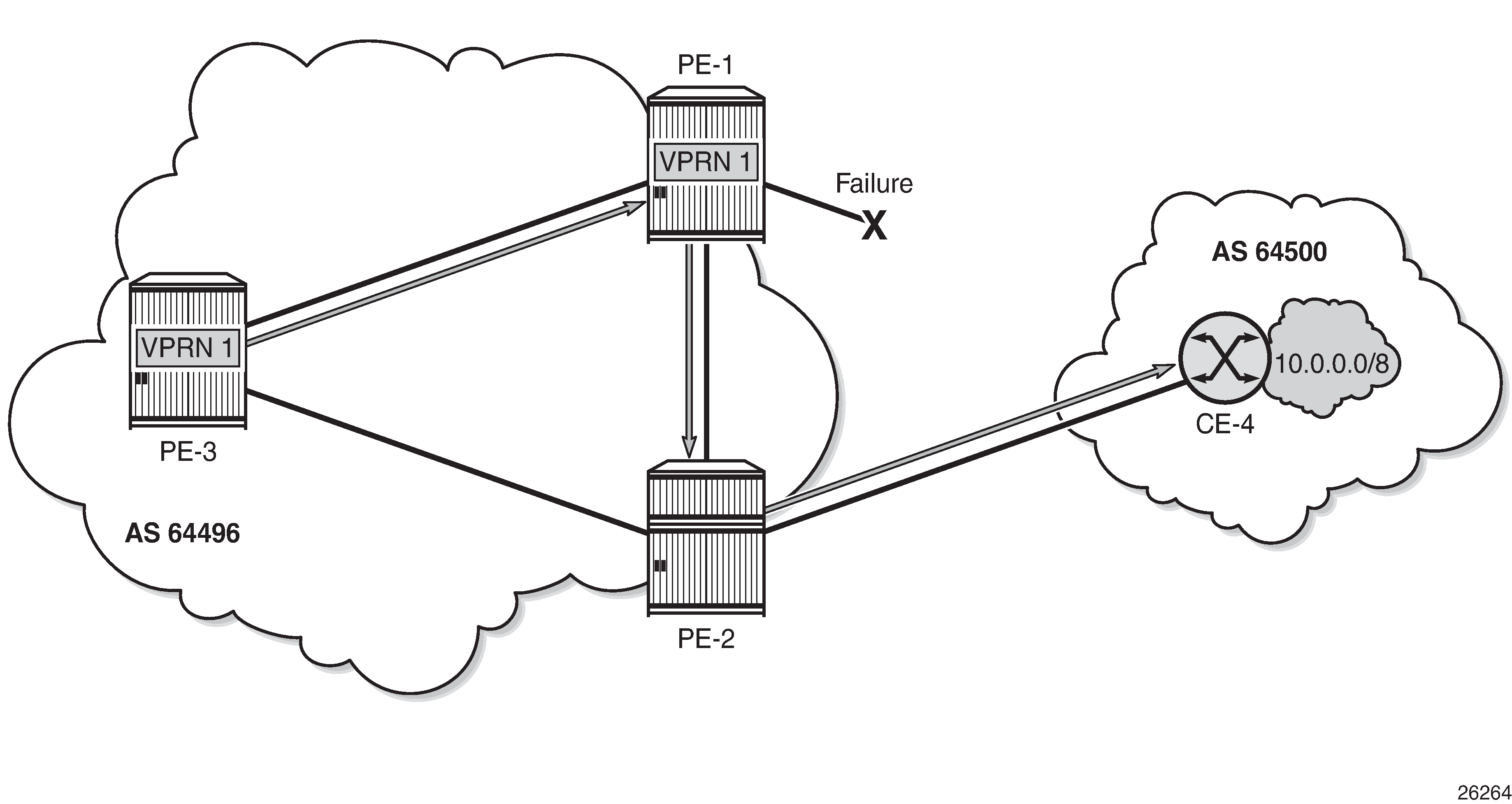 The PEs support BGP Fast Reroute (BGP FRR) using BGP VPN-IPv4 routes; therefore, PE-1 and PE-3 can install the route advertised by PE-2 as a backup path for prefix 10.0.0.0/8 and use that path immediately after detecting that the primary path has failed. When the link between PE-1 and CE-4 fails, PE-1 will detect this link failure typically seconds before the other PEs do. Therefore, PE-3 keeps sending traffic toward the network 10.0.0.0/8 to PE-1 and PE-1 uses the repair path via PE-2, as shown in BGP FRR on PE-1 after failure of active link to CE.