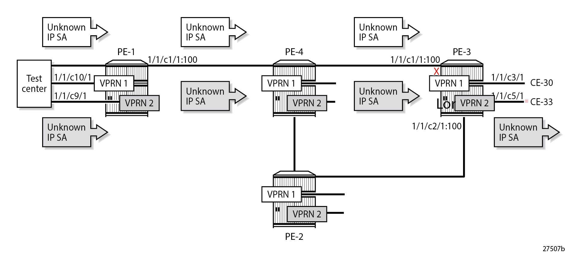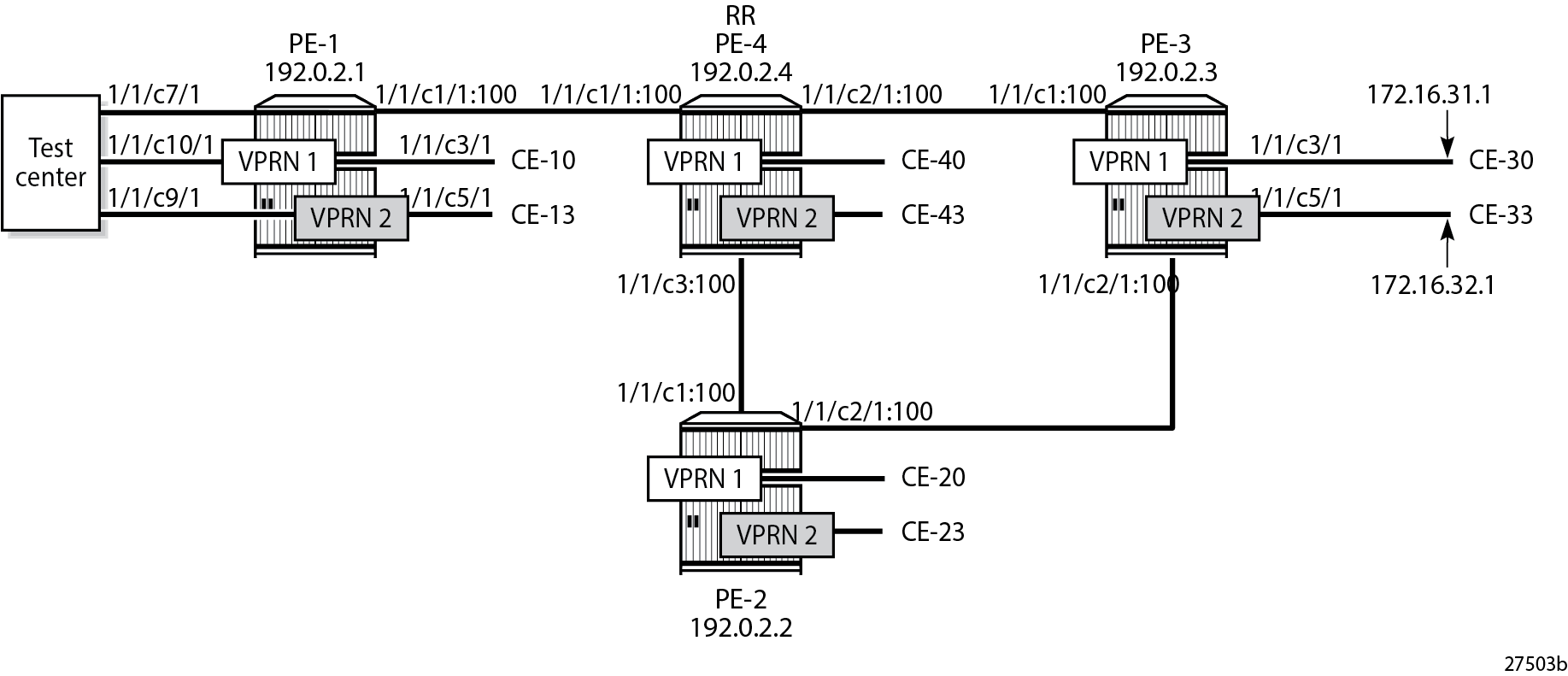 Port 1/1/c7/1 on PE-1 toward the test center is configured as a network port and is associated with a network interface in the base router. Ports 1/1/c9/1 and 1/1/c10/1 on PE-1 toward the test center are configured as access ports and associated with SAPs in the VPRNs.