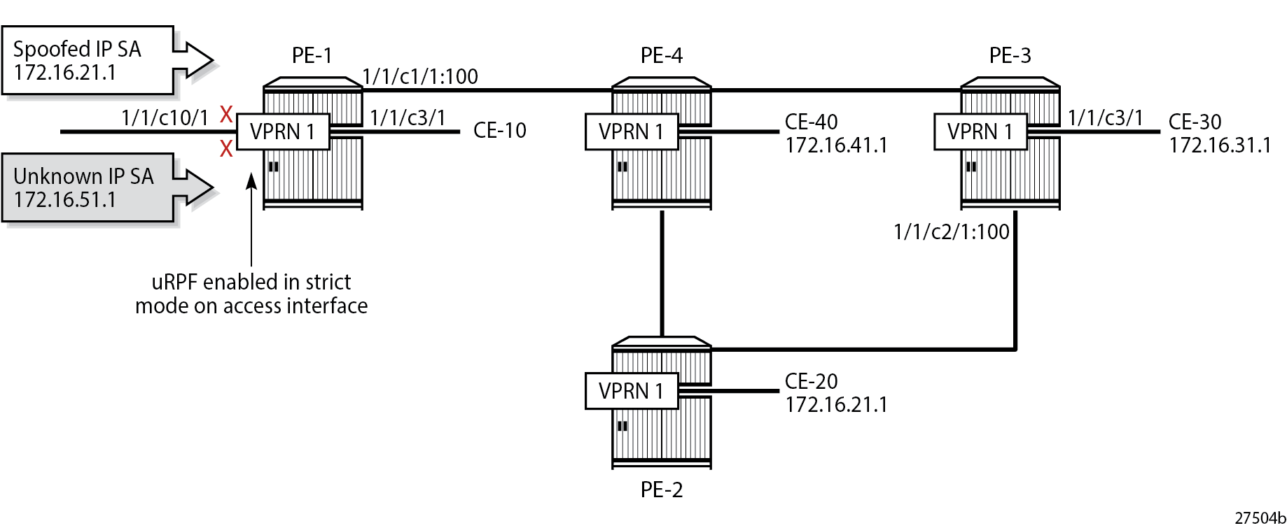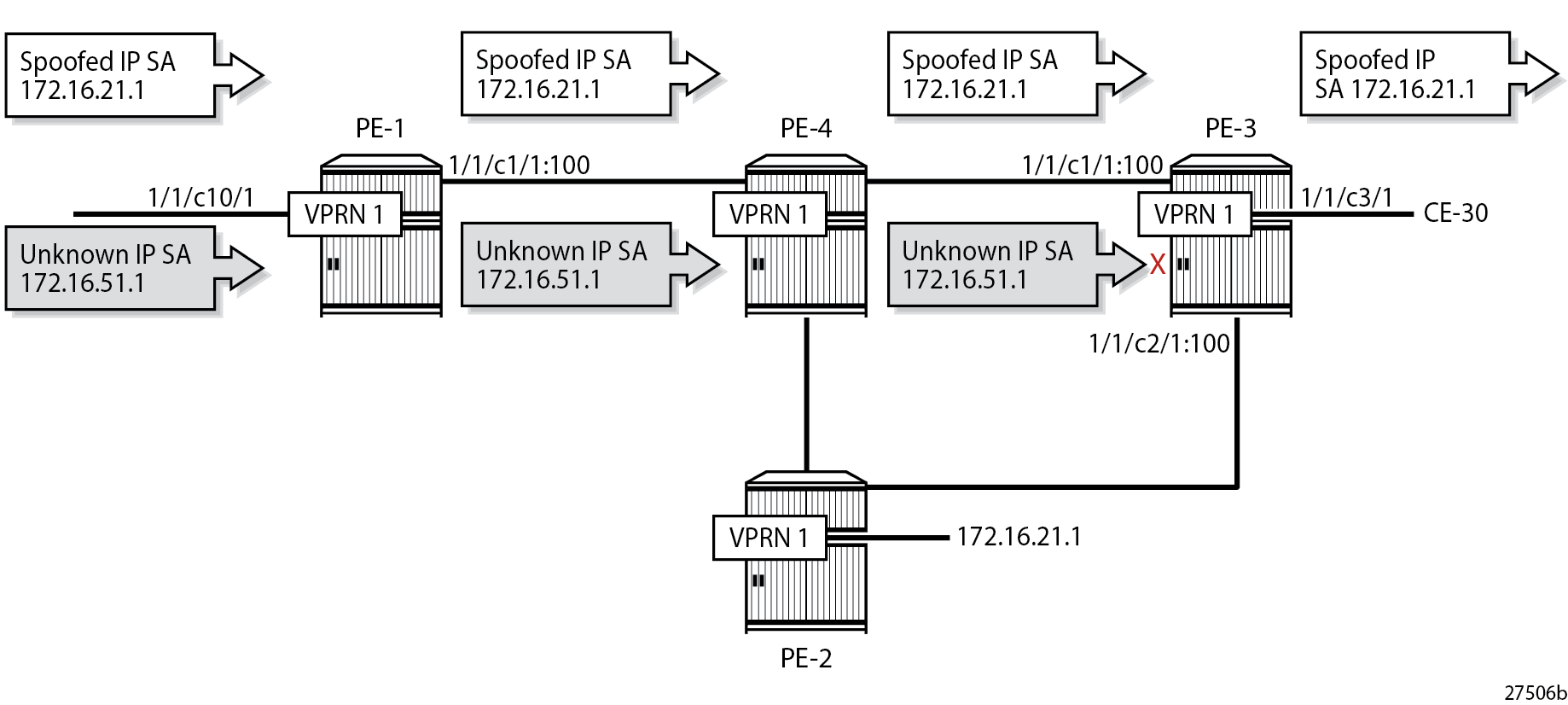 All IP packets with IP SA 172.16.21.1 are forwarded to CE-30, regardless of the interface where they are received, because no network interface is associated with prefix 172.16.21.0/24 in the FIB of VPRN 1. uRPF Checking in VPRN 1 on PE-3 shows that the only packets that are dropped on PE-3 have an IP SA for which no non-default route is present in the FIB of VPRN 1; in this case, IP SA 172.16.51.1.