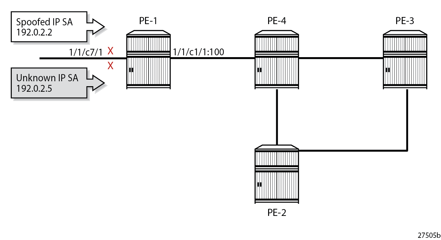 The uRPF control in the base router remains unchanged. In strict mode, PE-1 drops all packets with spoofed or unknown IP addresses on the incoming network interface, as shown in uRPF Checking in Strict Mode in Base Router on PE-1.
