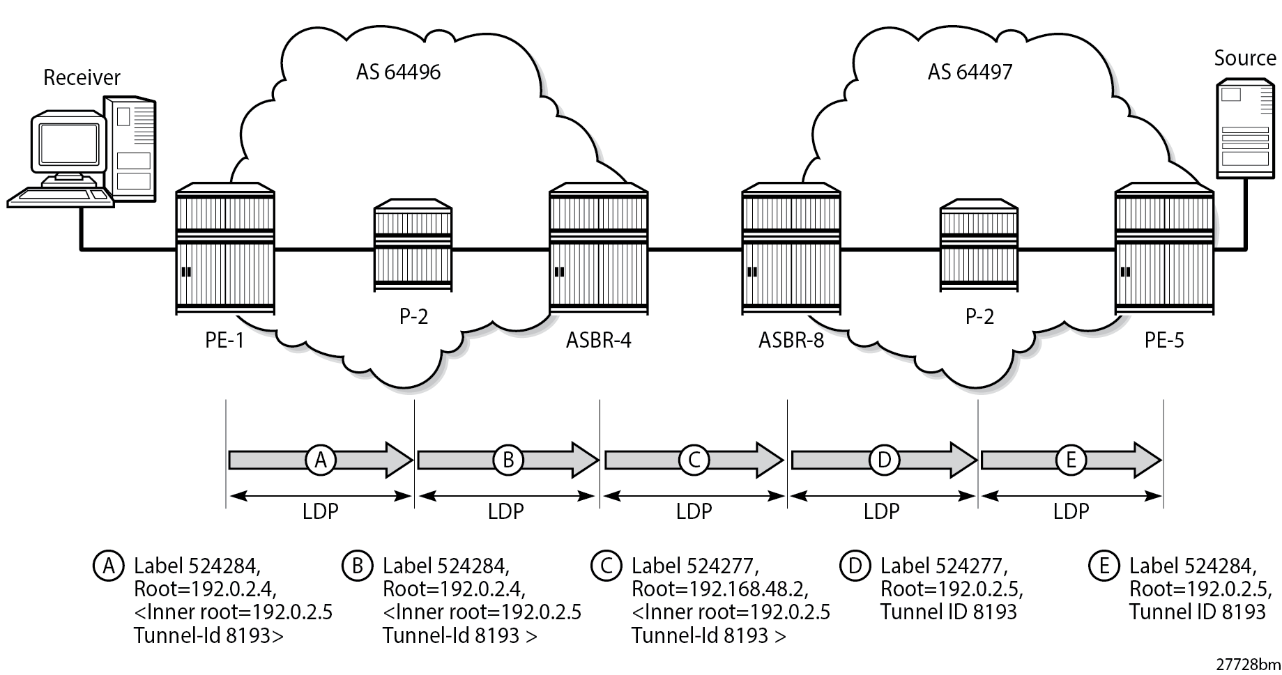 Unlike unicast, multicast requires a non-segmented provider tunnel for traffic to be routed from the root PE toward the receiver routers. This means that the tunnel must traverse multiple ASs without decapsulating and encapsulating labels at the AS boundaries, and therefore, must be non-segmented.