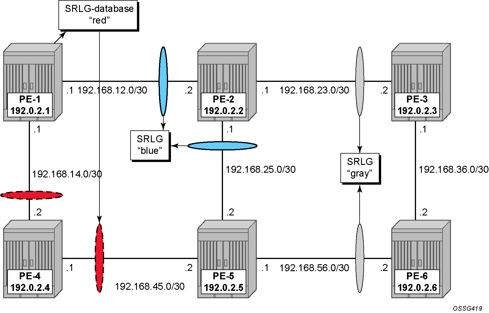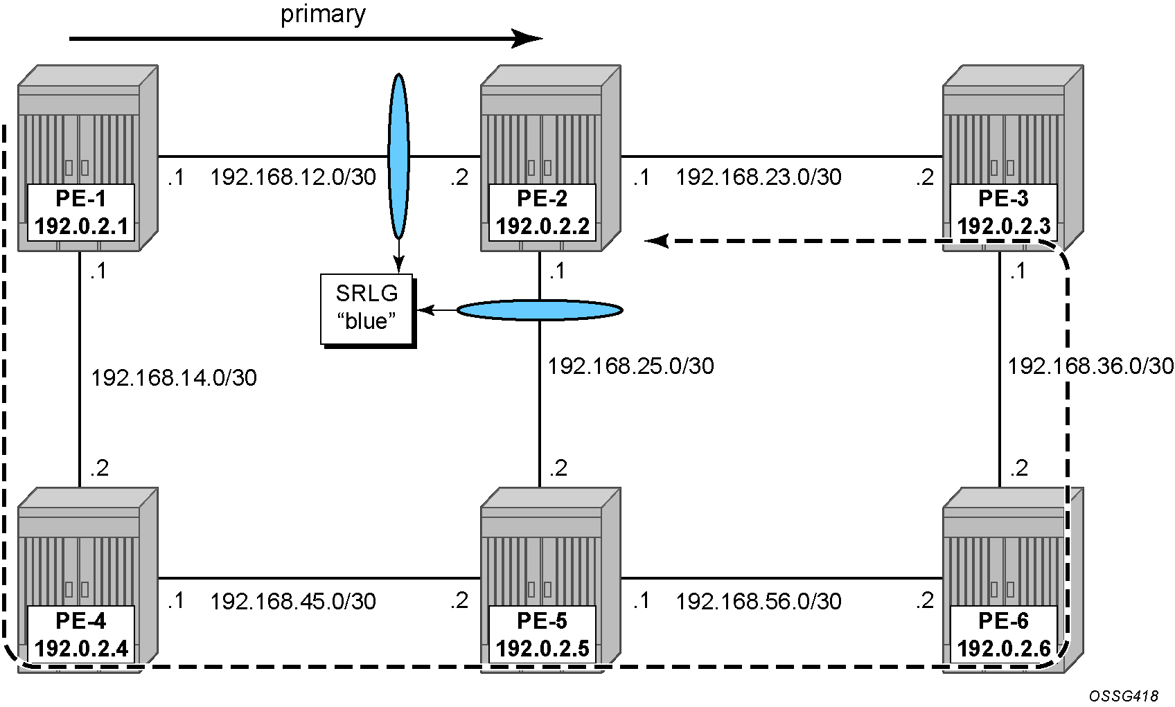 The IP/MPLS interfaces need to be linked to the related SRLG group, which is a unidirectional indicator, applying only to the egress direction; therefore, it needs to be configured on both sides of the IP/MPLS interface. For example, on PE-1, the interface to PE-2 is part of srlg-group "blue". An interface can be part of multiple SRLG groups similar to the admin-group functionality.