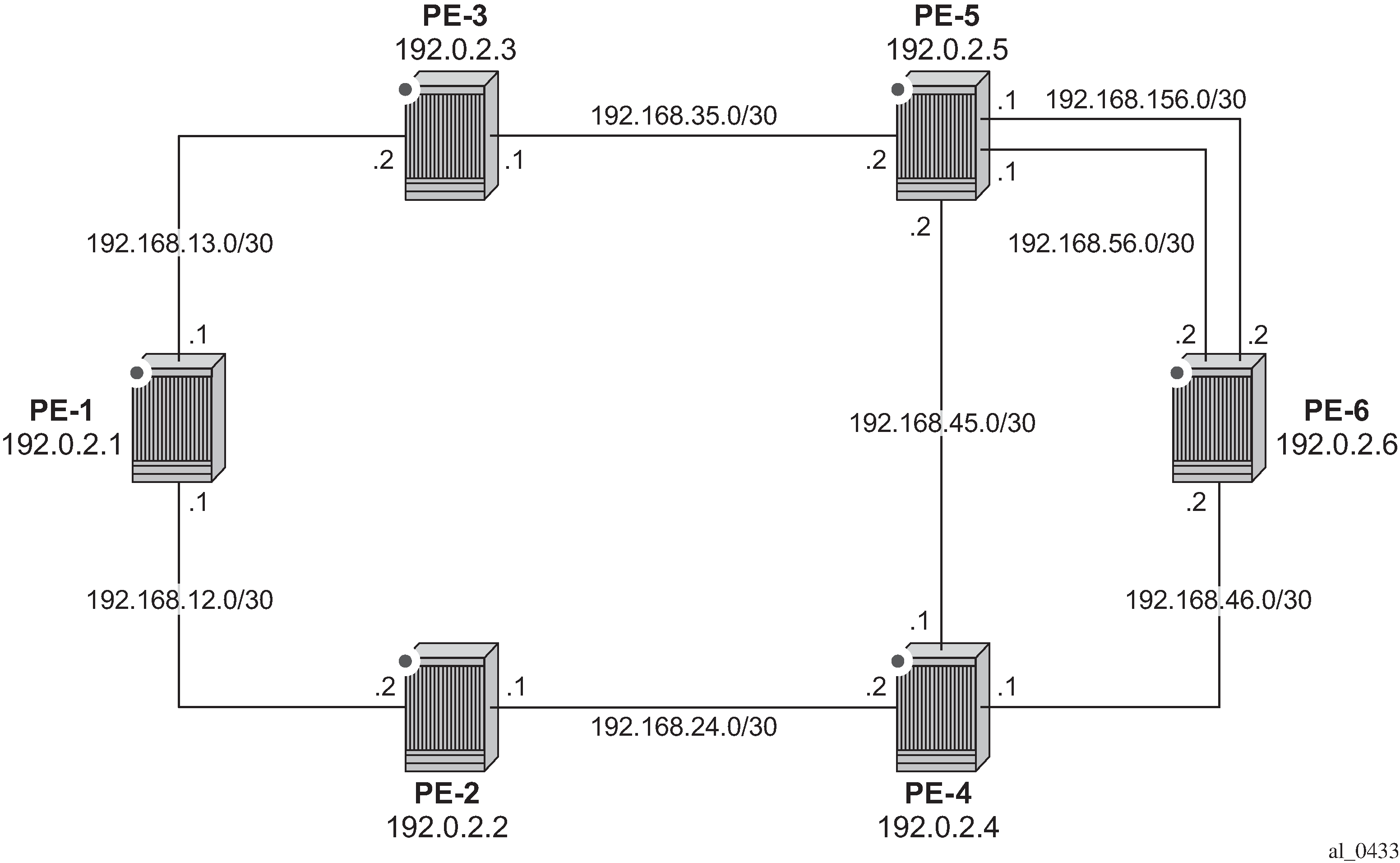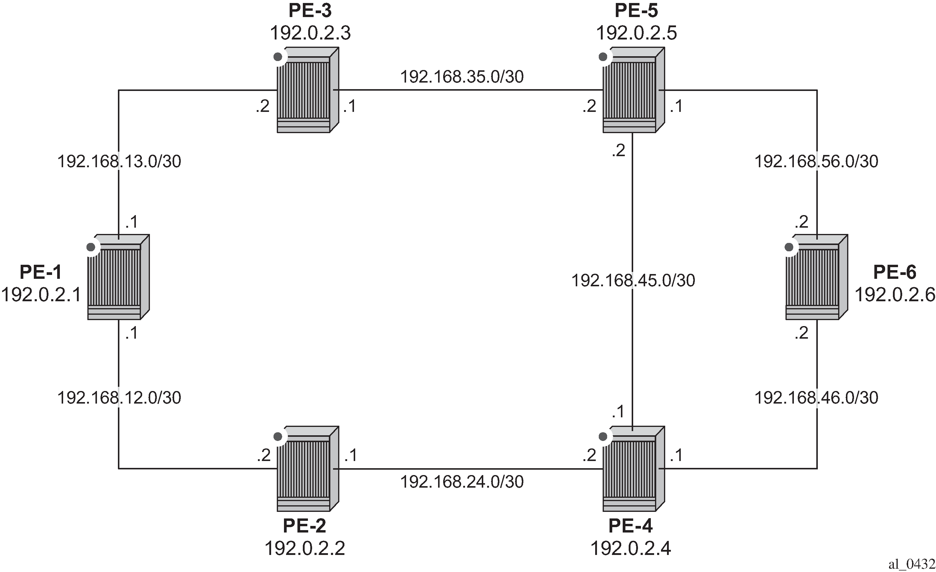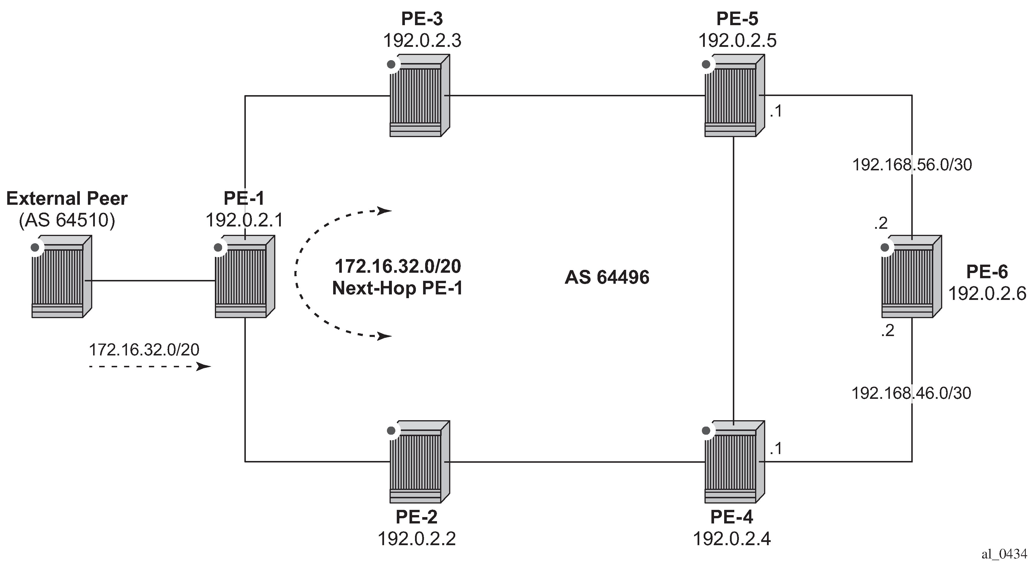 To validate the ECMP load balancing capability, PE-5 is configured to advertise prefix 172.16.5.0/24 to PE-6. In turn, PE-6 is configured for ibgp-multipath to enable load balancing over IGP links to the BGP next hop address, next-hop-resolution shortcut-tunnel resolution-filter ldp to enable tunneling of traffic destined toward the BGP next hop in MPLS, and ecmp 2. For additional information on BGP multipath, see the BGP Multipath chapter in the 7450 ESS, 7750 SR, 7950 XRS, and VSR Unicast Routing Protocols Advanced Configuration Guide for Classic CLI.