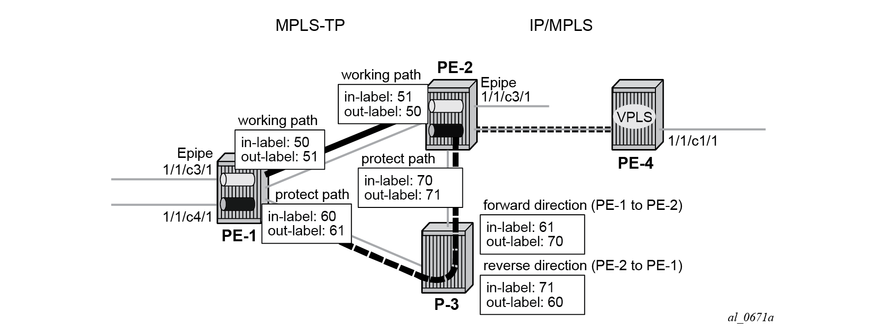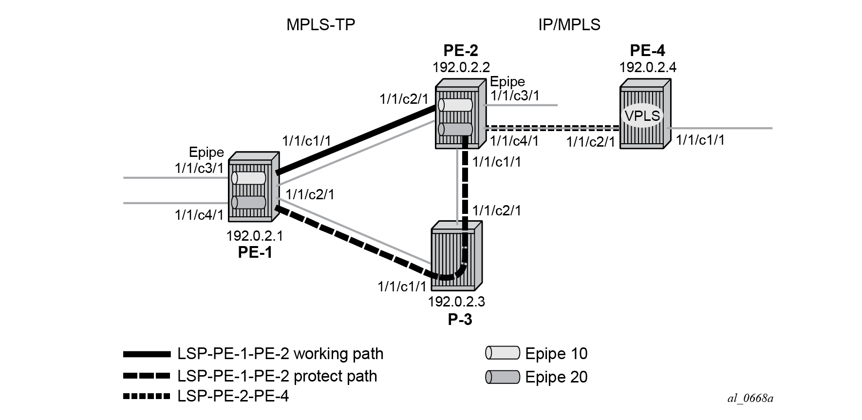 MPLS-TP example network showing services detail shows further details of the logical architecture of the services in the example network. The Epipe spoke-SDPs use the static MPLS-TP transport LSP between PE-1 and PE-2, and the dynamically signaled RSVP-TE LSP between PE-2 and PE-4. The MPLS-TP LSP is protected using 1:1 linear protection, with a working path from PE-1 to PE-2, and a protect path from PE-1, through LSR P-3, to PE-2. The Ethernet PW for Epipe 10 connects an Ethernet SAP on port 1/1/c3/1 on PE-1 to an Ethernet SAP on port 1/1/c3/1 on PE-2. The PW for Epipe 20 connects an Ethernet SAP on port 1/1/c4/1 on PE-1 to the VPLS on PE-4 and is switched between a static MPLS-TP segment and a dynamic targeted LDP (T-LDP) segment at PE-2. PE-2 thus acts as a gateway between the MPLS-TP domain and the IP/MPLS domain.