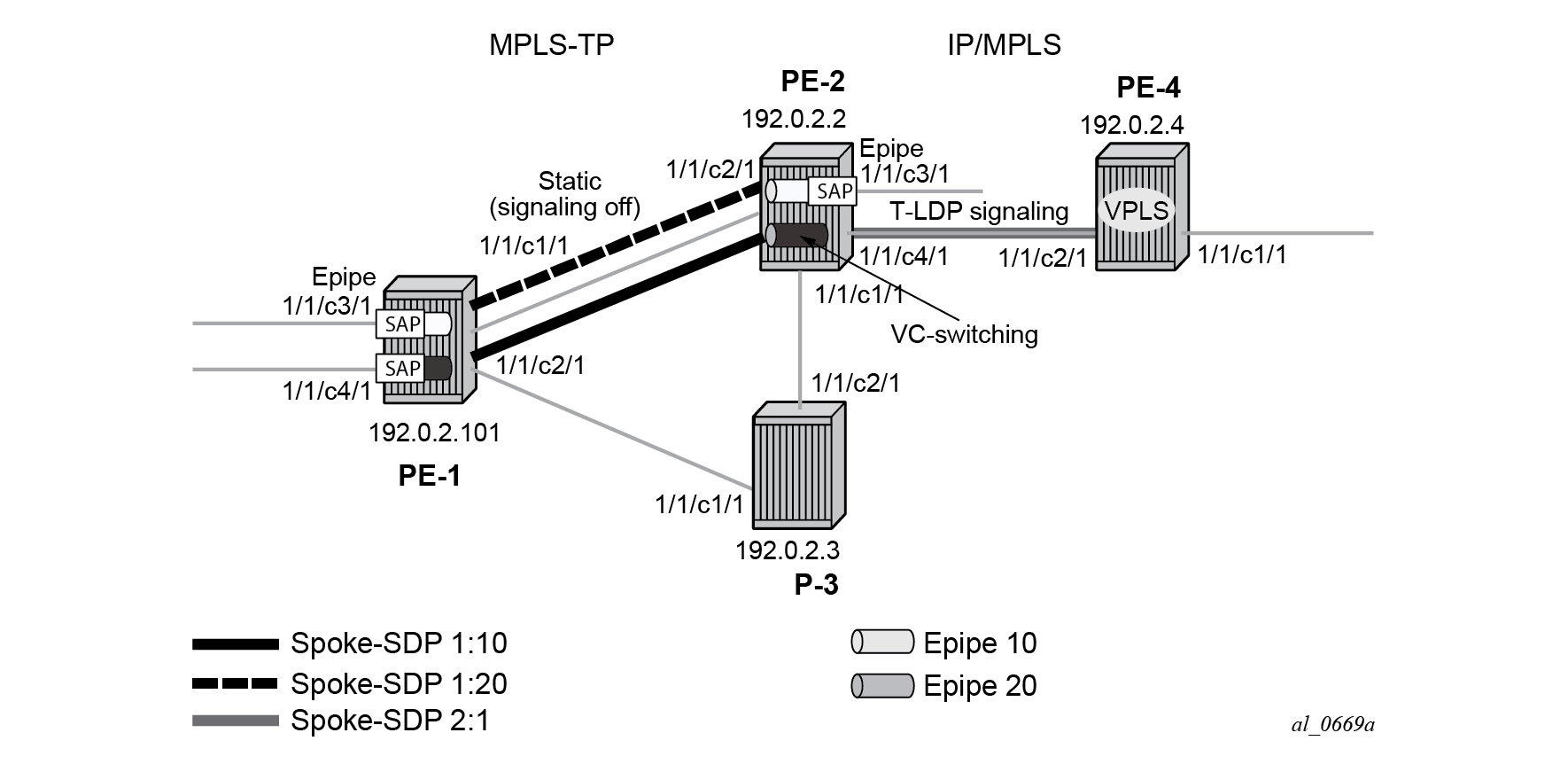 At PE-2, Epipe 10 terminates on a SAP on port 1/1/c3/1, while Epipe 20 is switched between a static MPLS-TP PW segment (spoke-SDP 1:20) and a T-LDP signaled PW segment (spoke-SDP 2:1) for backhaul to the remote PE-4 containing the VPLS service.