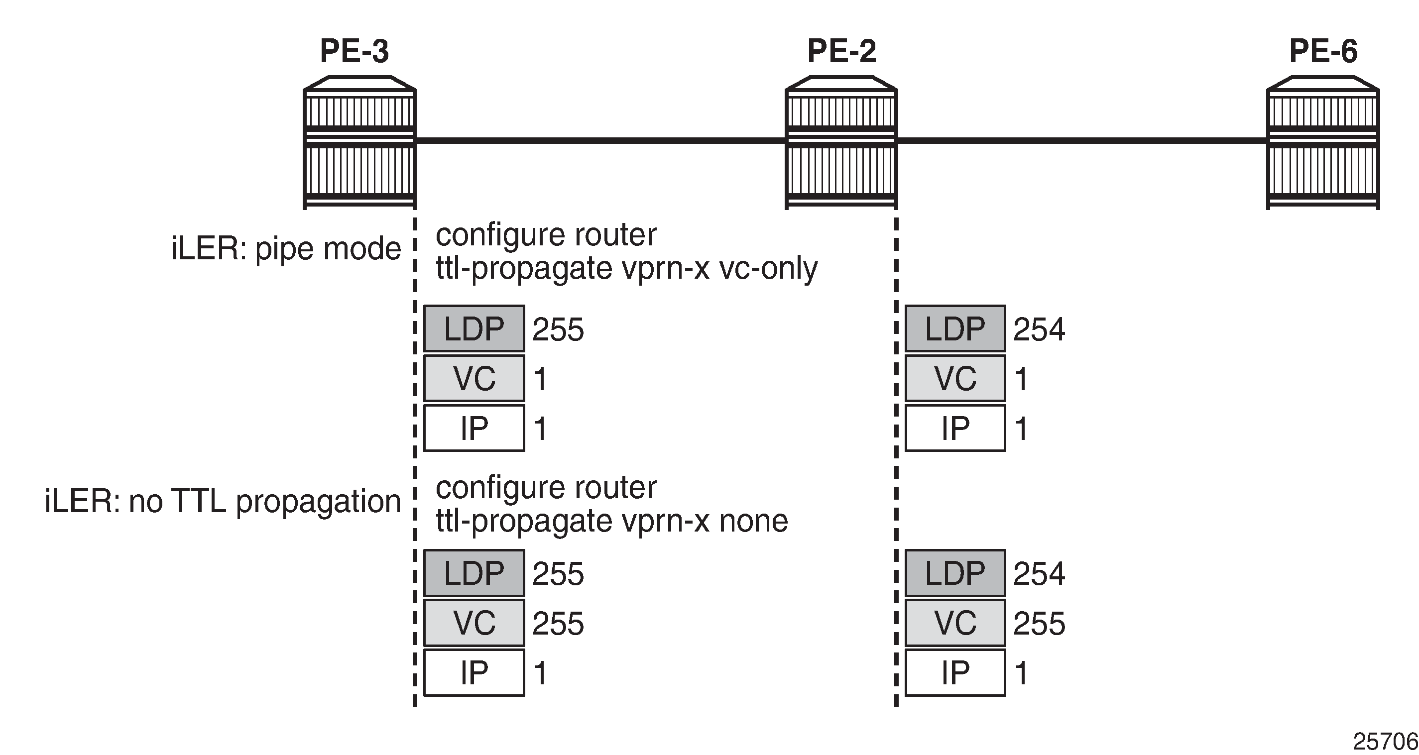 Pipe mode: No TTL is propagated from the IP header to the MPLS headers in the transport MPLS stack. However, the IP TTL is propagated to the bottom header: the virtual circuit (VC) header |