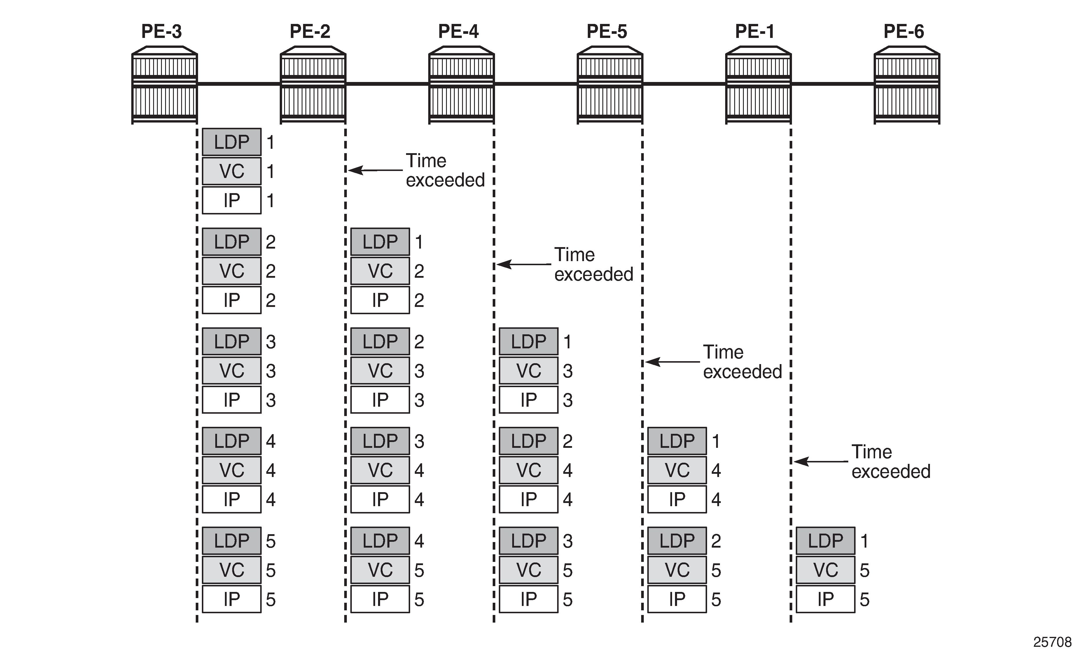 For LSR PE-1, the LDP transport label toward PE-6 is 524287, but this label will not be present in the traceroute detailed output, because this message cannot time out on an LSR where ICMP tunneling takes place: