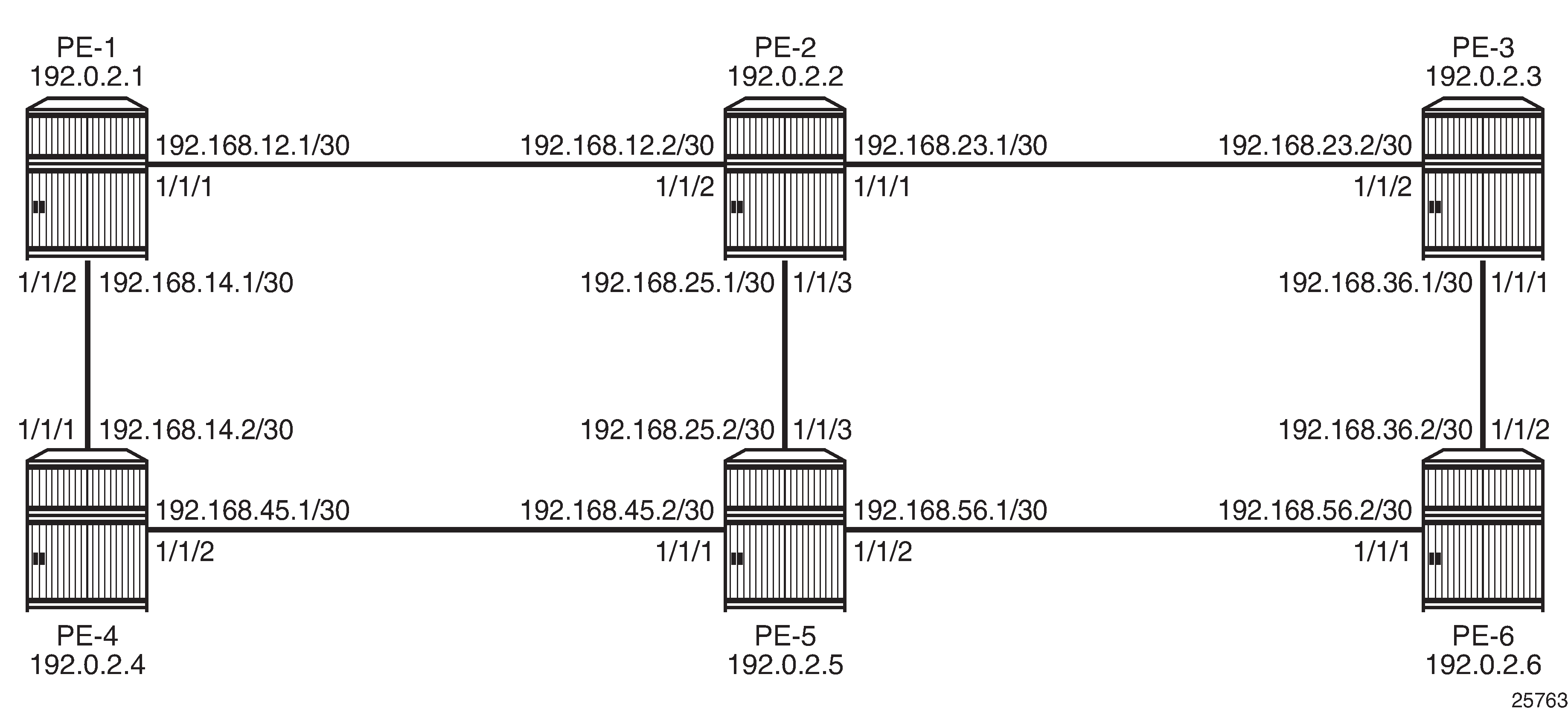 MPLS example topology shows the example topology consisting of six SR OS nodes located in a single autonomous system.