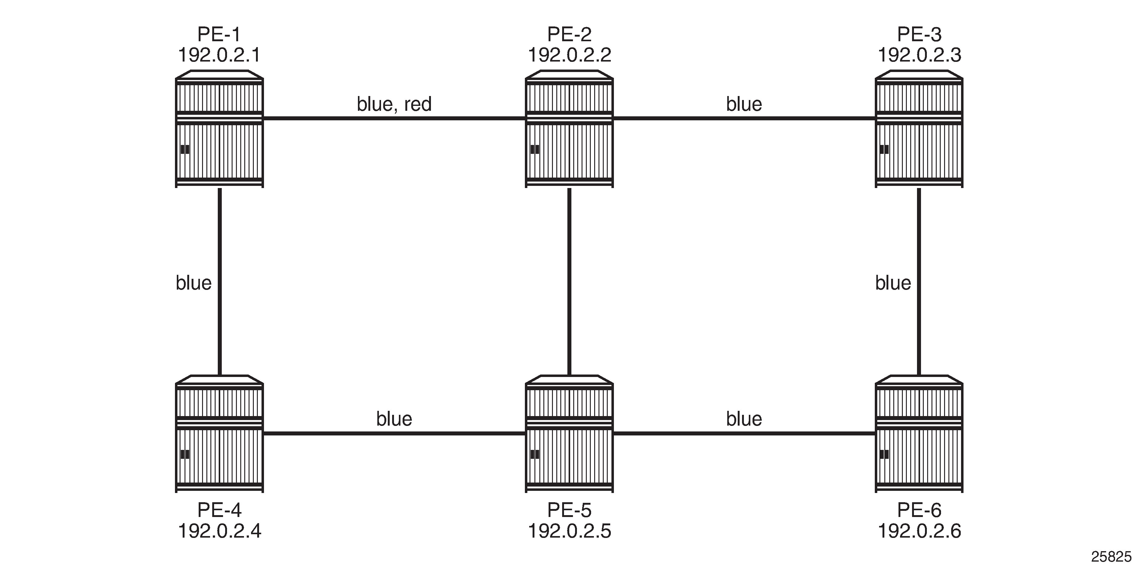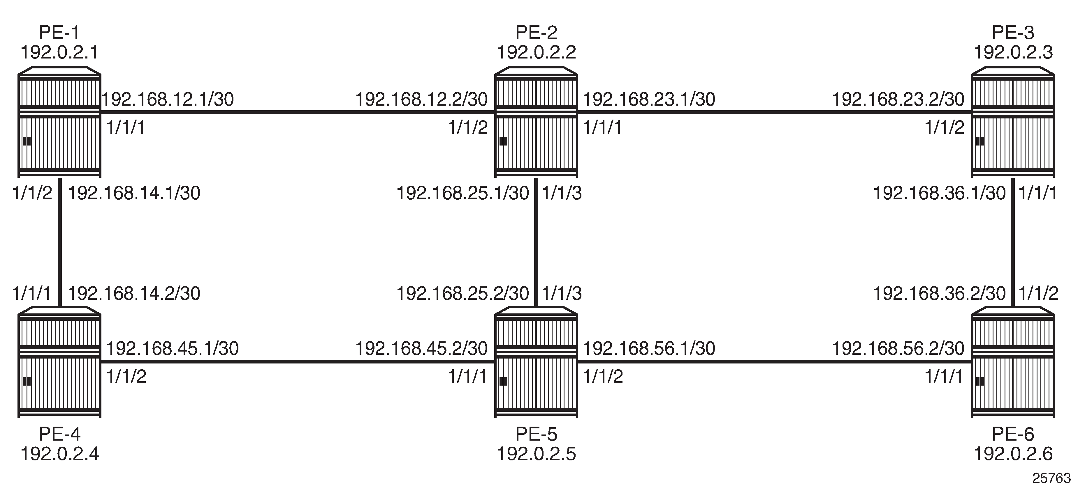 MPLS example topology shows the example topology consisting of six SR OS nodes located in a single autonomous system.