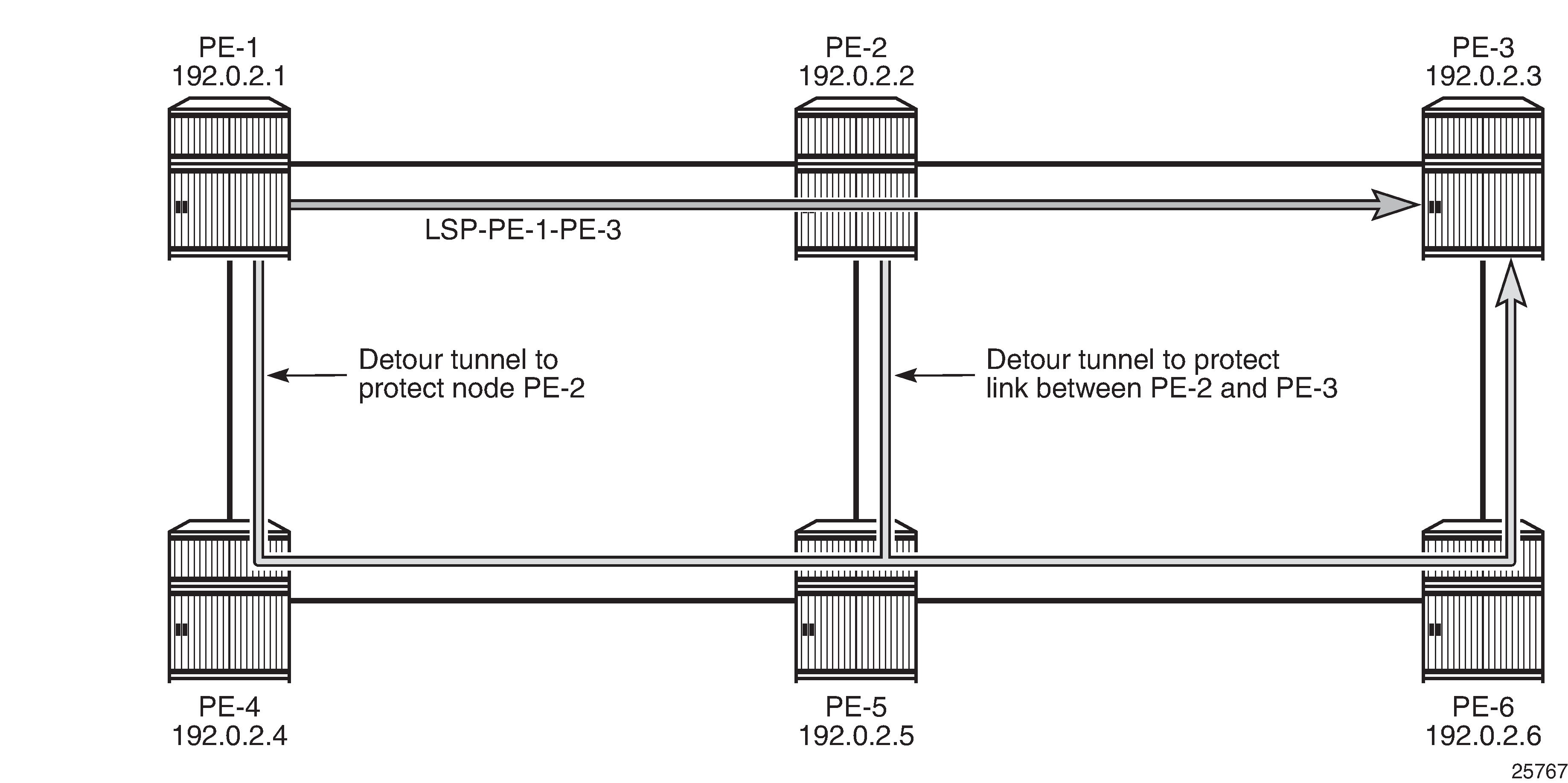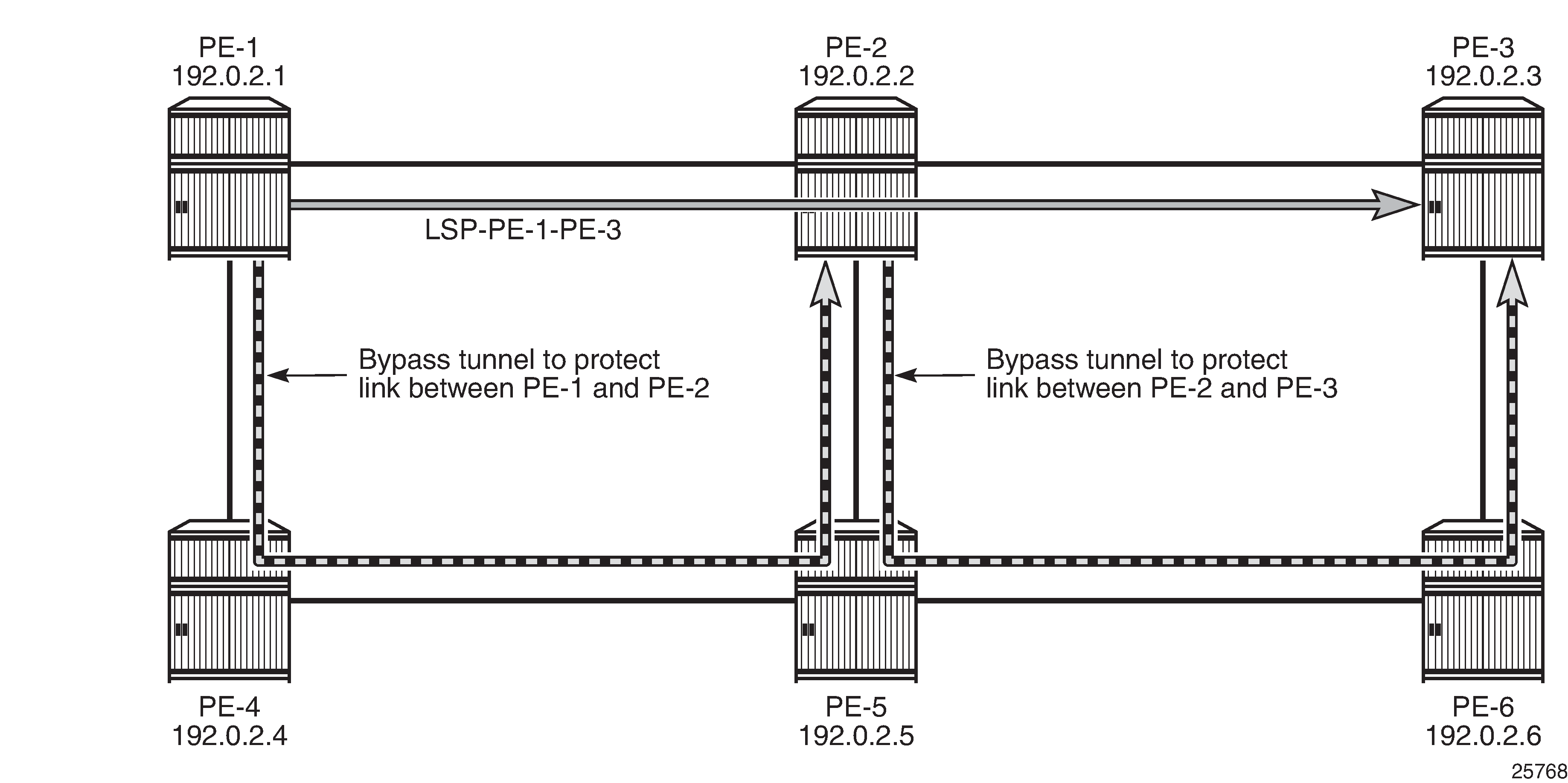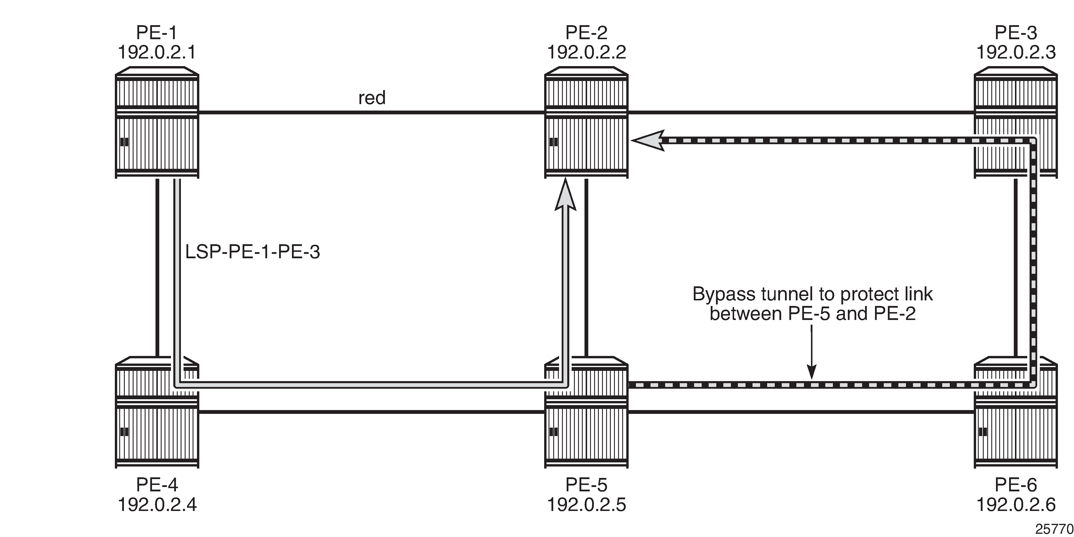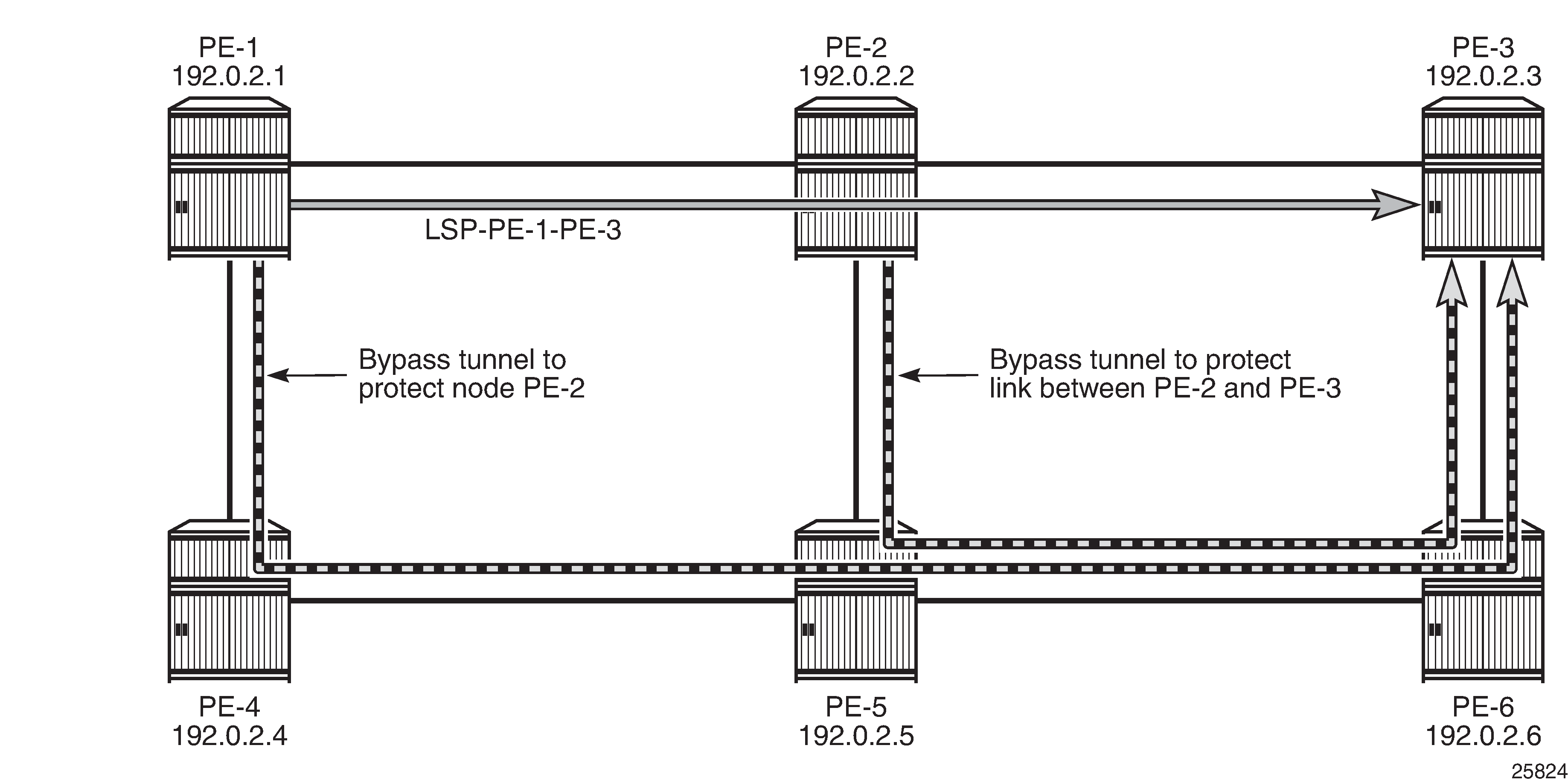 FRR facility defines local repair tunnels avoiding one particular node (the next hop in the data path) or one particular link (the next link in the data path), ignoring the eLER. These bypass tunnels originate in a point of local repair (PLR) and terminate in a merge point (MP) on the LSP. Bypass tunnels are shared between LSPs.