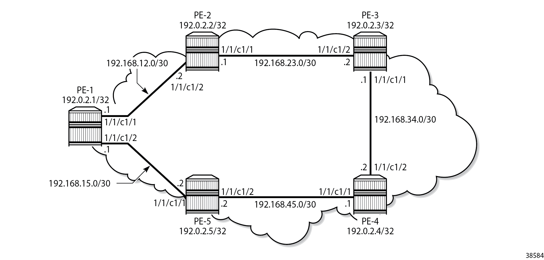 Example topology shows the example topology that contains five 7750 SRs in a ring topology.