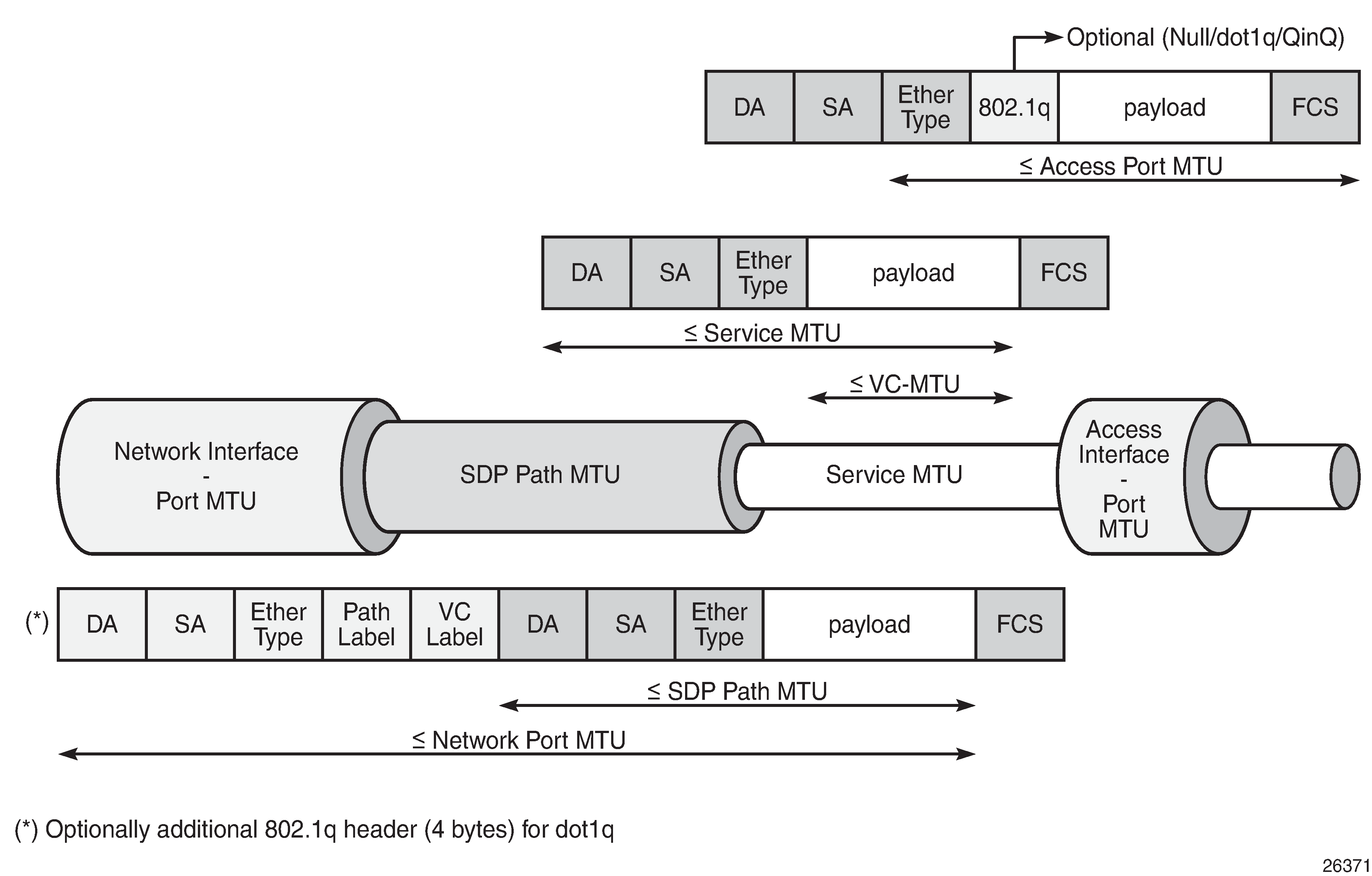 The VC MTU contains the IP payload. The service MTU contains IP payload and Ethernet header. The SDP path MTU must be greater than or equal to the service MTU. Typically, the VLAN tags are stripped at the service ingress, unless VLAN range SAPs are defined and one VLAN tag is preserved. The physical port MTU on an Ethernet access interface needs to be set to at least 1514 for null encapsulation (1500 + 14 (Ethernet header)), at least 1518 for dot1q (1500 + 14 + 4 (dot1q)), and at least 1522 for QinQ (1500 + 14 + 4 + 4).