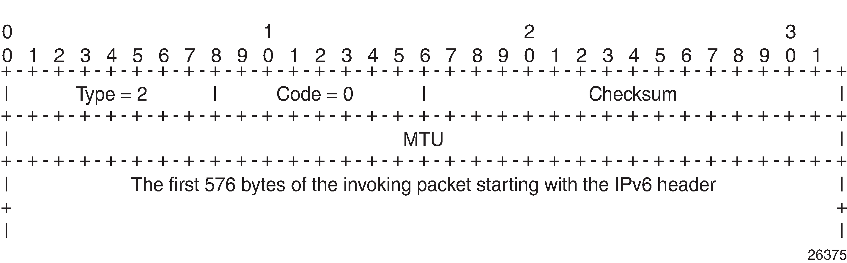 The mechanism for IPv6 is similar, but the format of the ICMPv6 message is different. For IPv6, the router will send an ICMPv6 error message of type 2 ("Packet Too Big") and code 0, as shown in ICMPv6 "Packet Too Big" message. The MTU field is populated with the MTU of the egress interface to the destination of the packet on the router that dropped the packet. The MTU is a count of the octets of the IP header and IP data, but no lower-level headers.