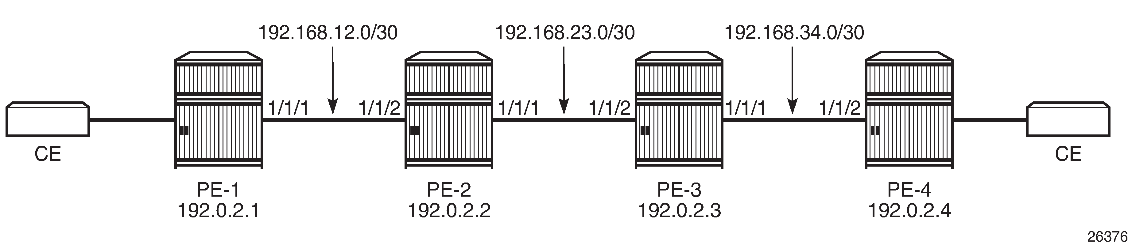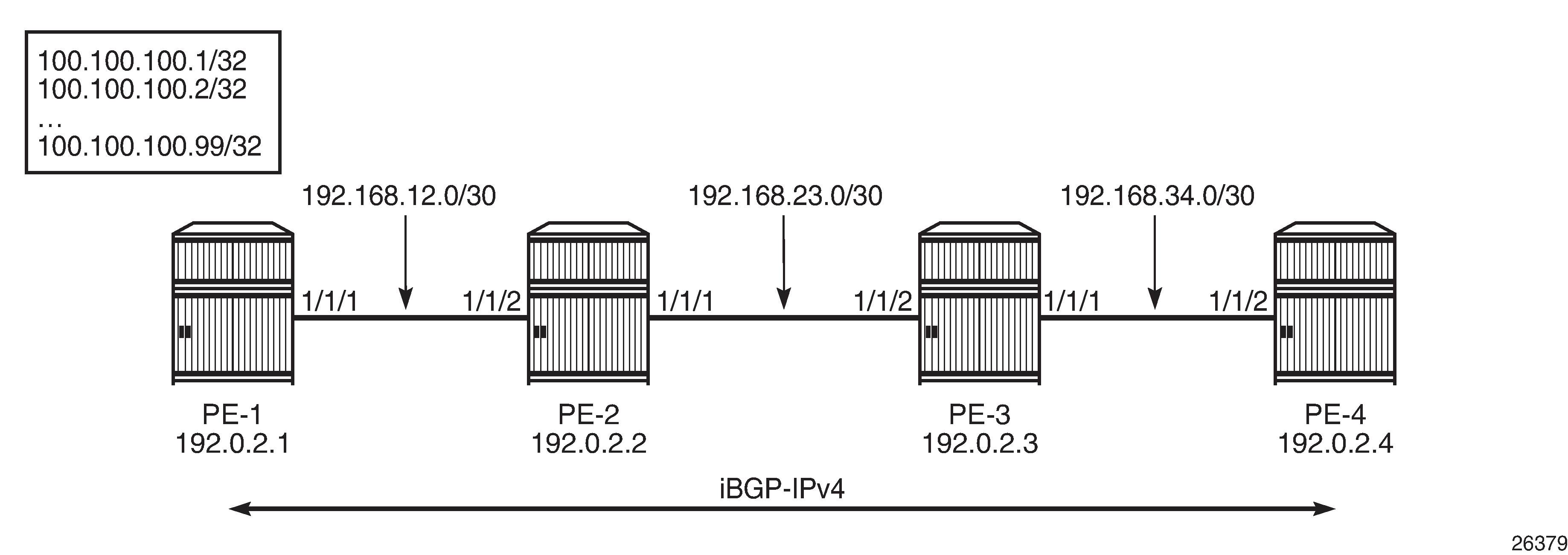 Example topology shows the example topology with four PE nodes in autonomous system 64496. The interfaces have IPv4 and IPv6 addresses, but in this figure, only the IPv4 addresses are shown.