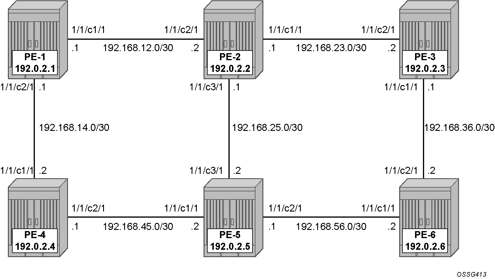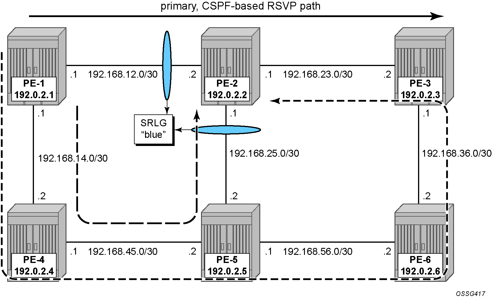 The IP/MPLS interfaces need to be linked to the related SRLG group, which is a unidirectional indicator, applying only to the egress direction; therefore, it needs to be configured on both sides of the IP/MPLS interface. For example, on PE-1, the interface to PE-2 is part of srlg-group "blue". An interface can be part of multiple SRLG groups similar to the admin-group functionality.