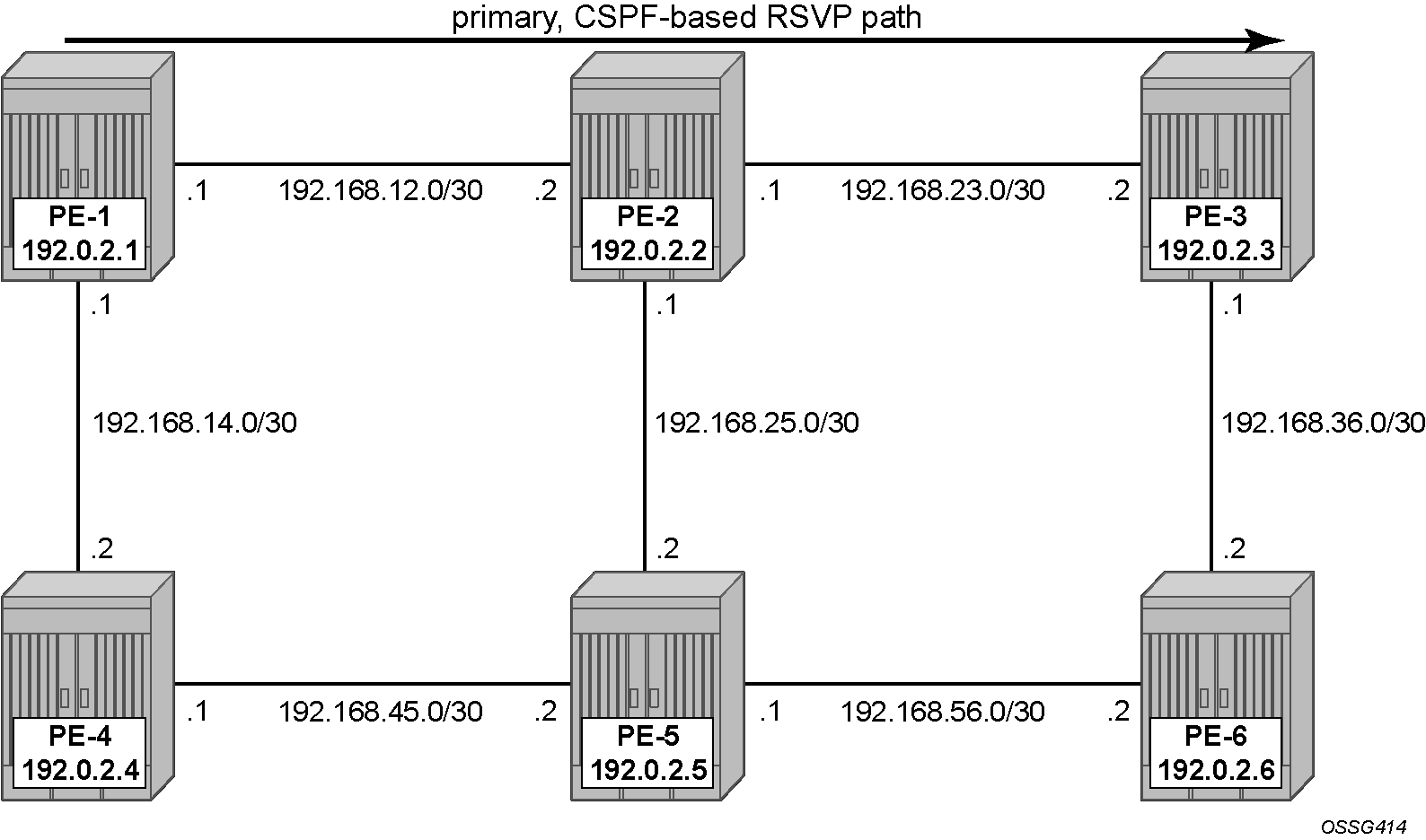 IS-IS, MPLS, and RSVP are configured on all interfaces. TE is enabled in IS-IS. Optionally, admin groups "green" and "red" are configured on all nodes. The "green" links are the following: the link between PE-1 and PE-2, the link between PE-2 and PE-3, and the link between PE-3 and PE-6. The "red" links are: the link between PE-1 and PE-4, the link between PE-4 and PE-5, and the link between PE-5 and PE-6. The remaining link is the link between PE-2 and PE-5, which does not belong to an admin group. For more information about admin groups, see chapter RSVP Point-to-Point LSPs.