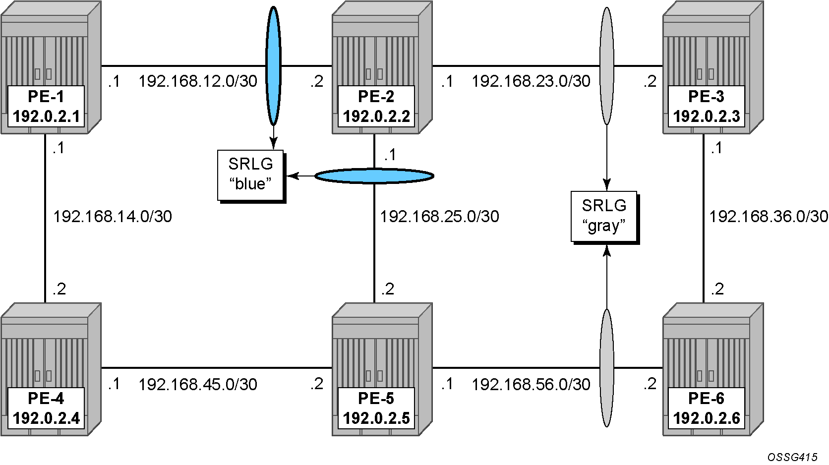 The configuration of the blue SRLG group is only mandatory on PE-1, PE-2, and PE-5, while the gray SRLG group is only mandatory on PE-2, PE-3, PE-5, and PE-6. However, it is good practice to configure both SRLG groups on all nodes, as follows: