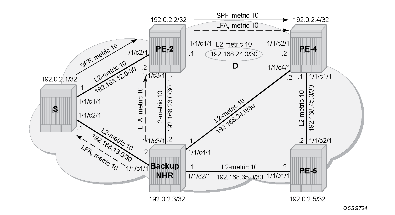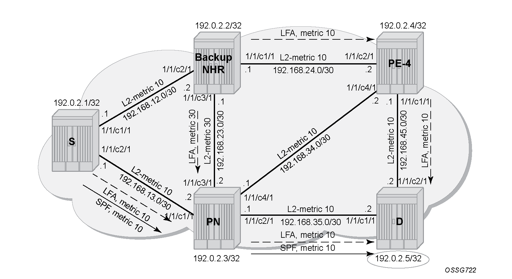 SP(backup NHR, D) < {SP(backup NHR, S) + SP(S, D)}Prefix 192.0.2.5/32 : SP(PE-2,PE-5) < SP(PE-2,PE-1) + SP(PE-1,PE-5)For a link LFA next-hop calculation of prefix 192.0.2.5/32 (D) on PE-1, this means that the shortest path from backup next-hop router PE-2 toward destination PE-5 must be smaller than the sum of the shortest path from backup next-hop router PE-2 toward source PE-1 with the shortest path from source PE-1 to destination PE-5.