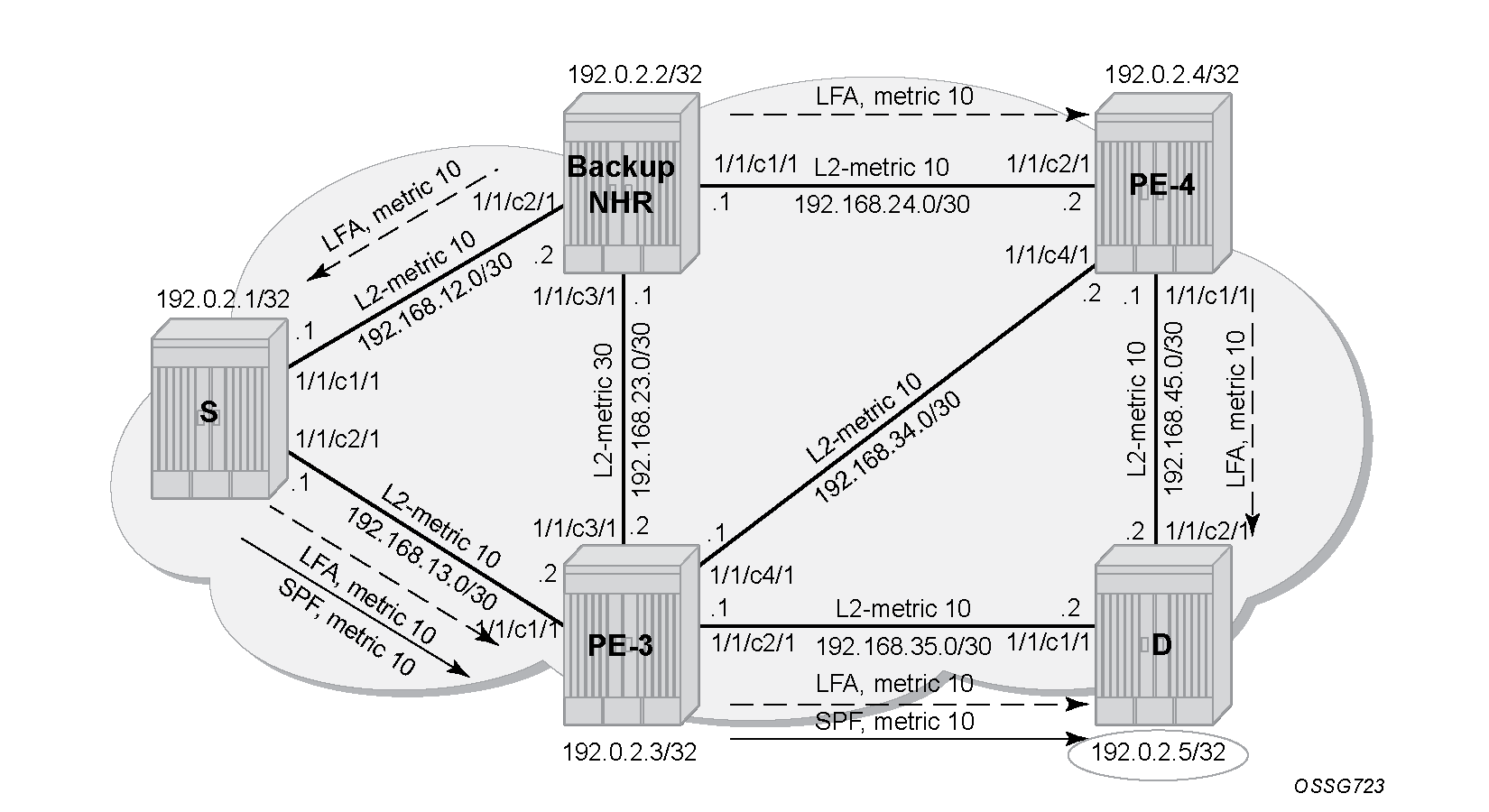 The SR OS software has implemented Inequality 1 (link criterion) and Inequality 3 (node criterion) of RFC 5286. Similar to the Shortest Path Tree (SPT) computation that is part of standard link-state routing functionality, also the LFA next hop computation is based on the IGP metric.