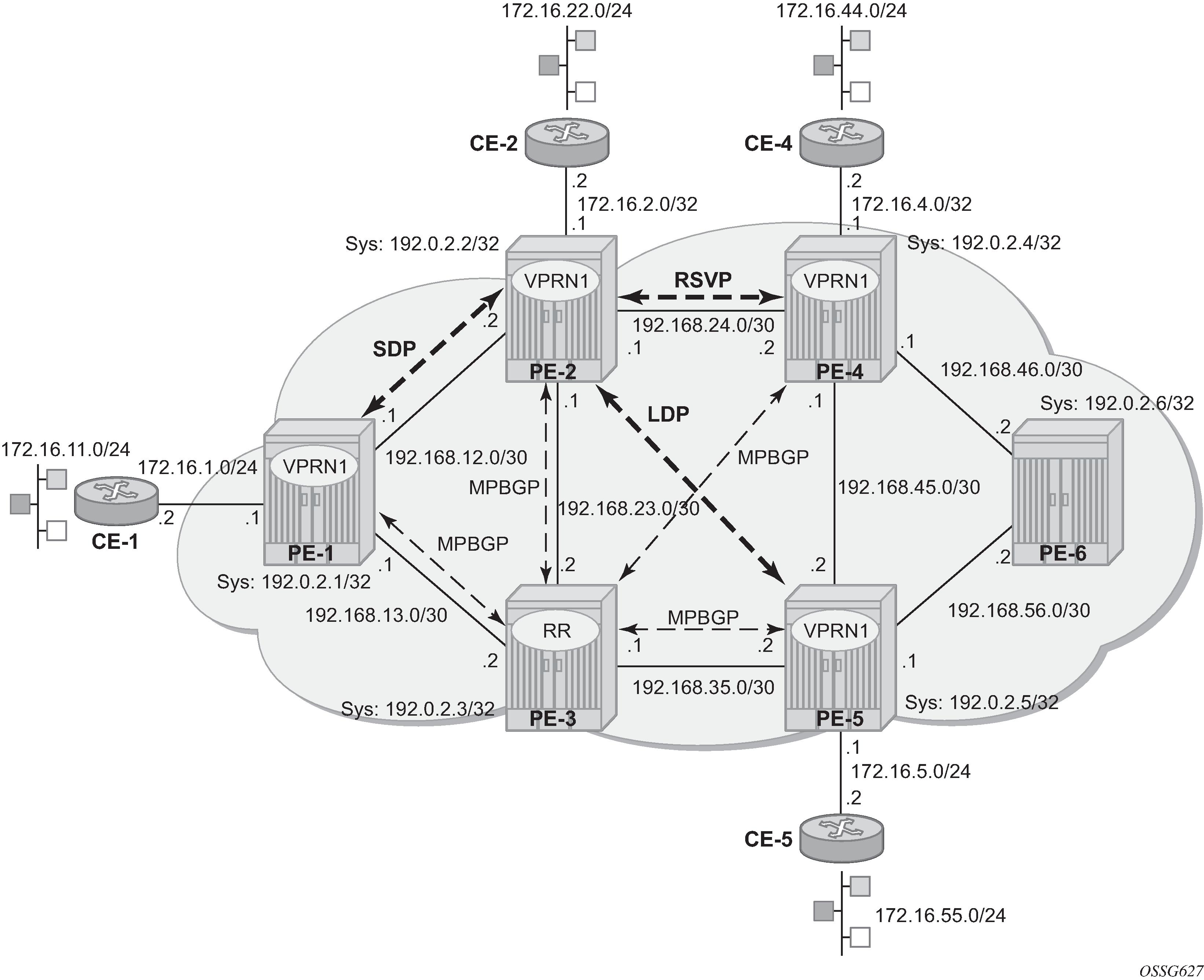 The example topology used in this example is shown in Example Topology. The setup consists of six 7750 service routers. There is a single AS and a single IGP area. The following configuration tasks should be completed first: