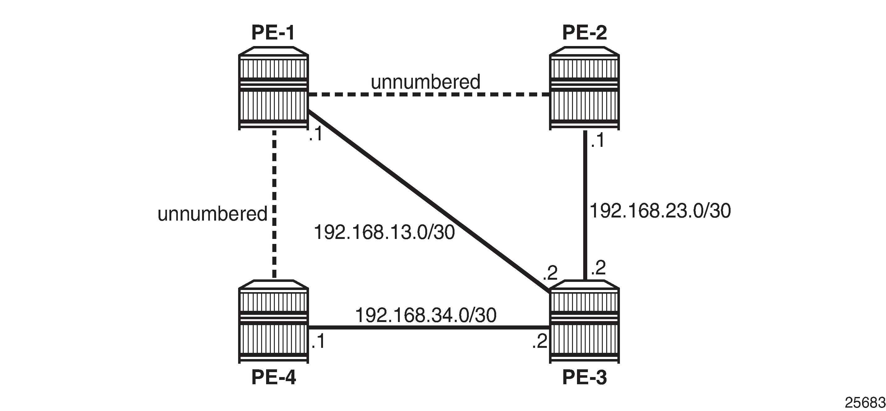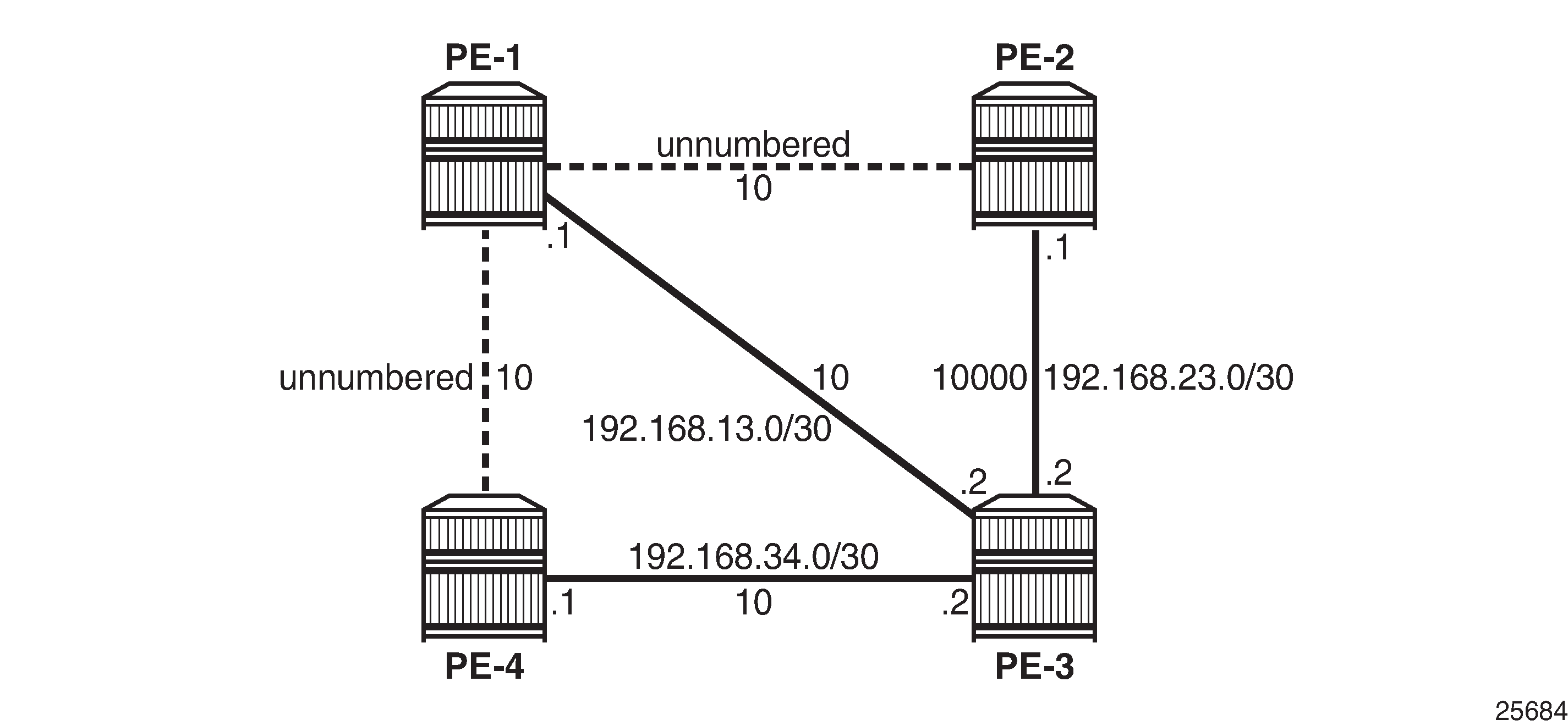 The configuration used in this chapter is shown in Example topology for unnumbered interfaces in RSVP and LDP. There are two unnumbered links: one between PE-1 and PE-2, and another between PE-1 and PE-4. The remaining links are numbered.
