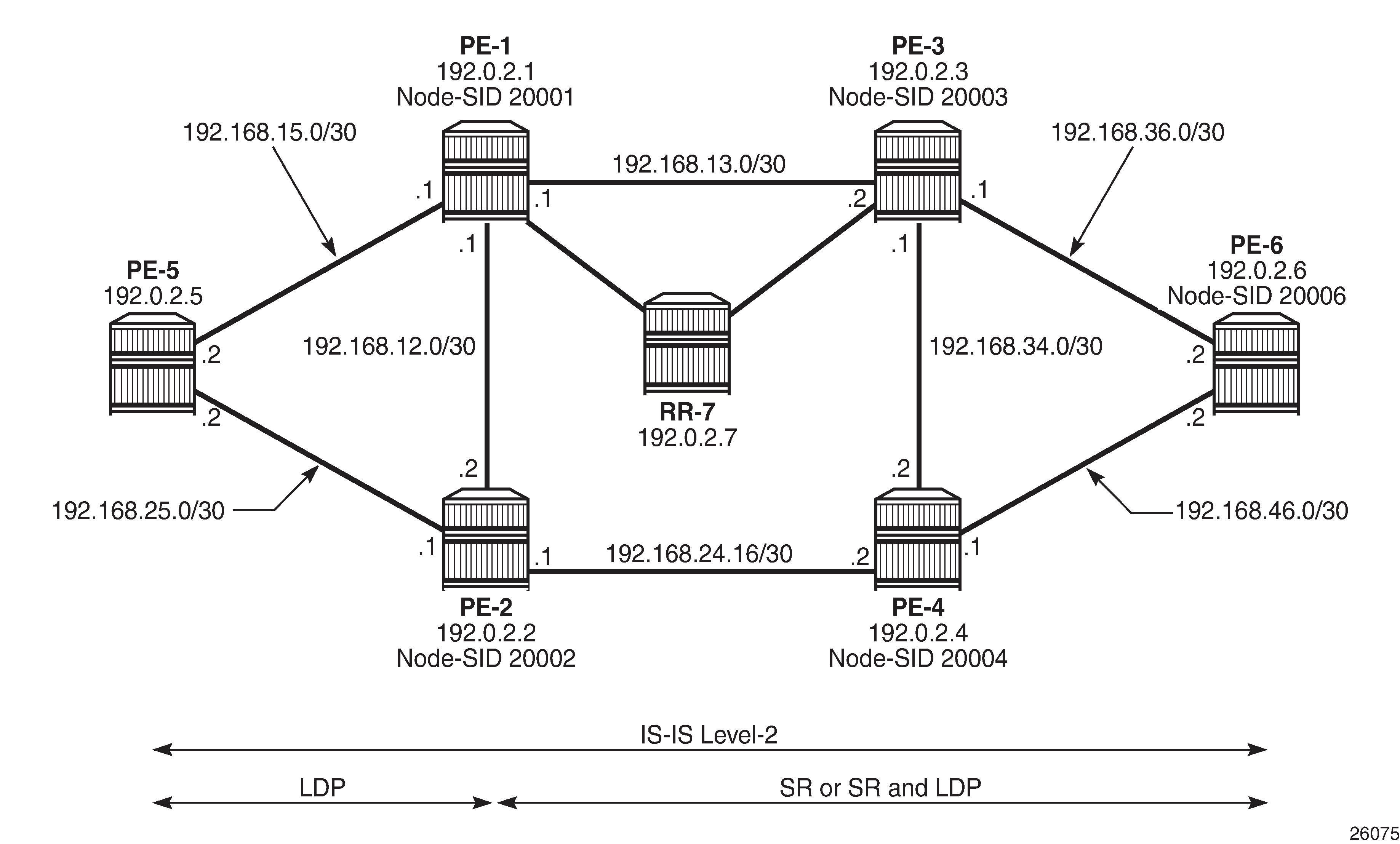 PE-5 is a router that does not support SR and, therefore, runs only LDP to its connected peers PE-1 and PE-2. PE-1, PE-2, PE-3, PE-4, and PE-6 are capable of running both SR and LDP, but are initially configured to only run SR with the associated node-SIDs shown in Example topology. When explicitly described, LDP will be enabled in conjunction with SR on these routers to show the difference between the two approaches, and to show how SR can be used as a fast reroute backup for SR primary LSPs.