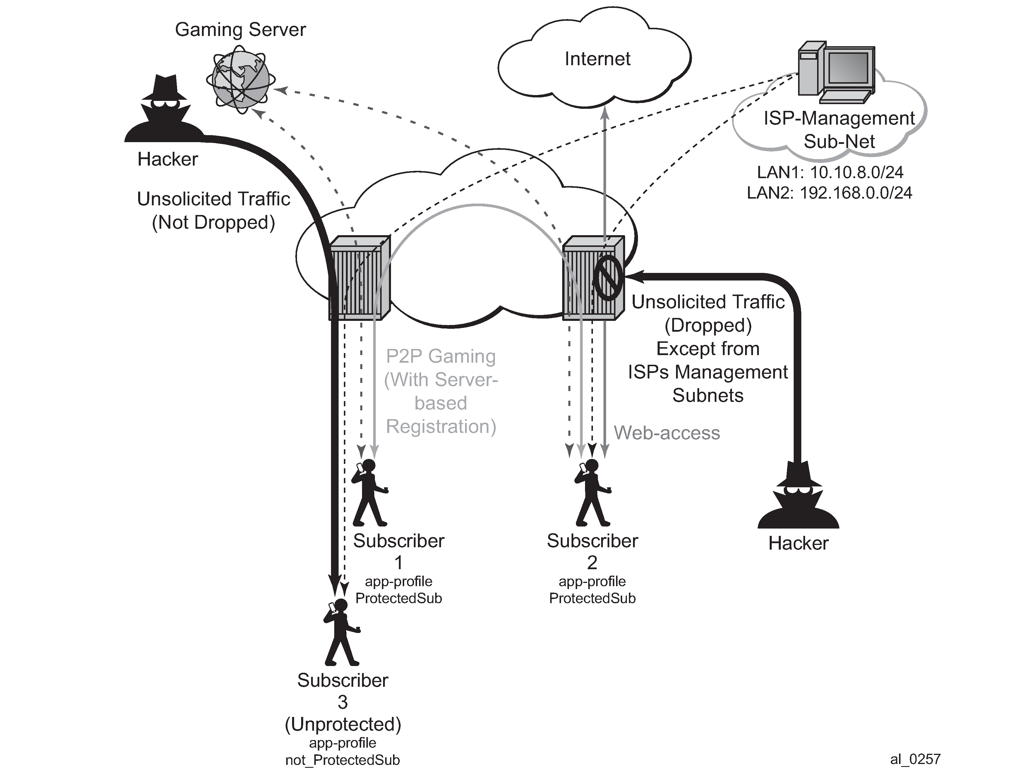 The objective of this chapter is to describe the required configuration within AA-ISA (divert to AA-ISA basic knowledge is assumed) to enable AA FW and protect AA subscribers from attacks (unsolicited attacks and DoS attacks), while still allowing pin-holing through the firewall, so that applications such as peer to peer gaming and various ALGs (such as FTP) are not affected.