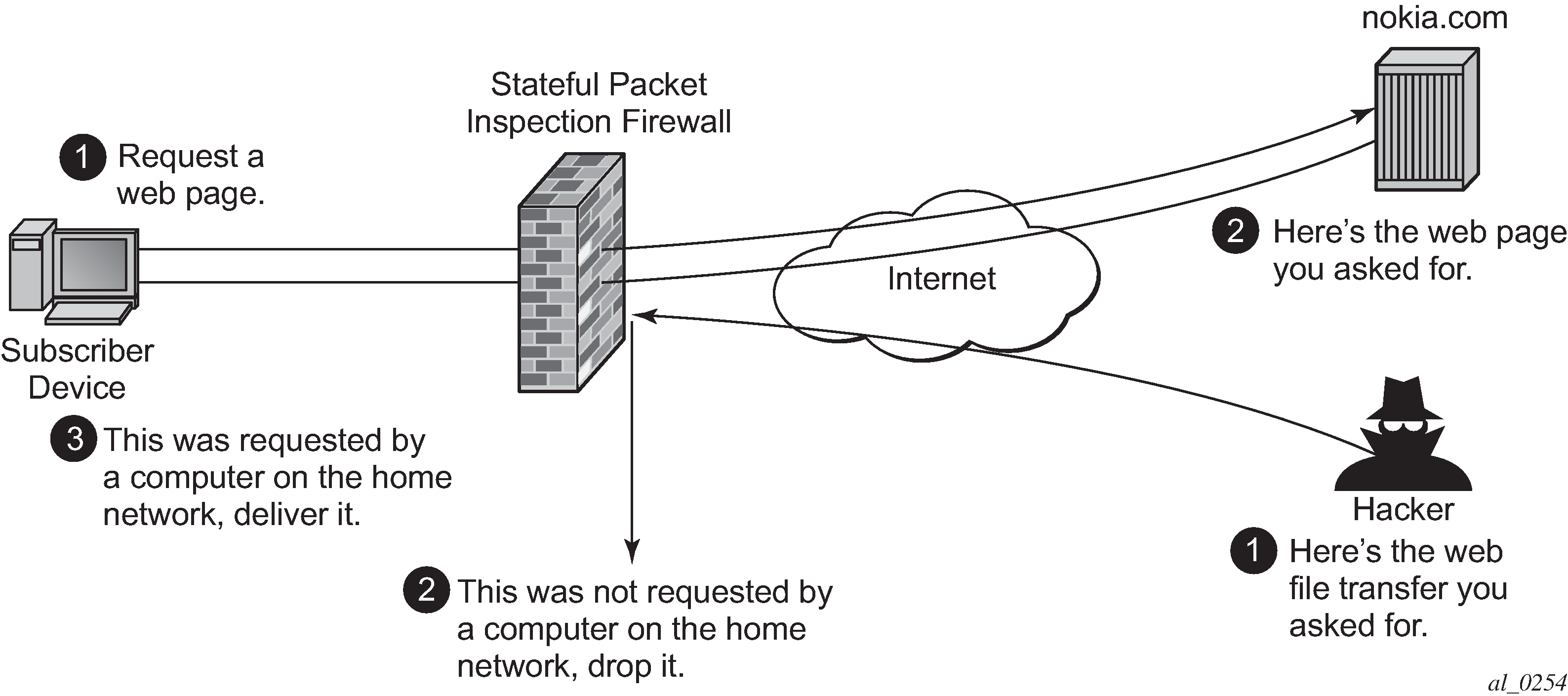 The AA stateful FW feature extends AA-ISA application level analysis to provide an in-line integrated stateful service that protects subscribers from malicious attacks. AA stateful packet filtering combined with AA layer 7 classification and control, empowers operators with advanced, next generation firewall functionality that is integrated within the Service Router. The AA stateful firewall (FW) and application firewall runs on AA-ISA. Using stateful inspection, the AA firewall not only inspects packets at layers 3-7, but also monitors and keeps track of the connection state. If the operator configures a deny action within a session filter, then the matching packets (matching both the AA Application QoS policy (AQP) and associated session filter match conditions) are dropped and no flow session state or context is created.