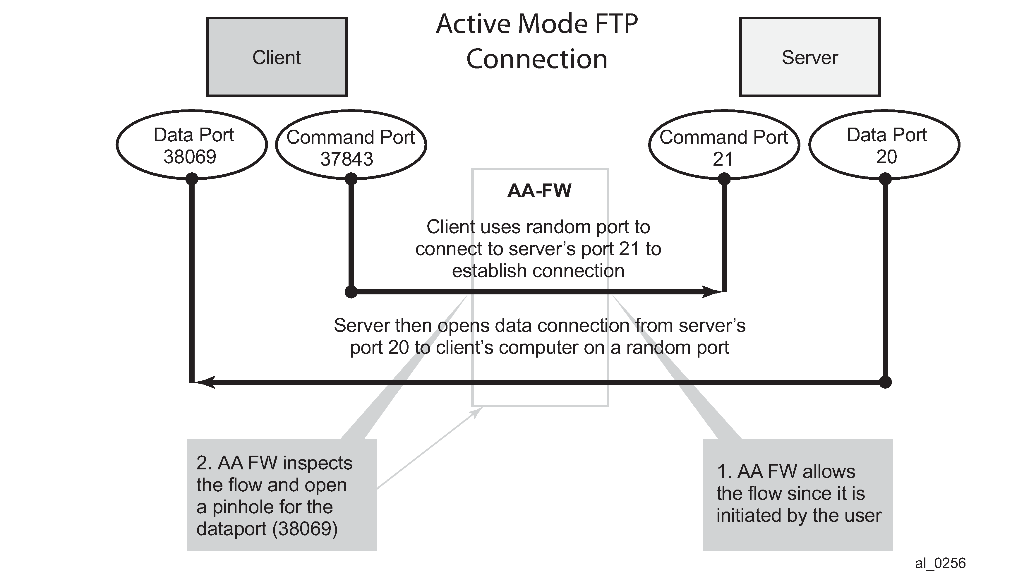 AA FW inspection of packets at Layer 7 offers application layer gateway functionality for a large list of applications (for example, FTP, SIP, RTSP, PPTP, IRC, and so on). These applications make use of control channels or flows that spawn other flows. AA FW inspects the payload of these control flows so it can open a pinhole in advance for unspawned data flows. ALG support example — FTP depicts an example of AA ALG support for FTP traffic.
