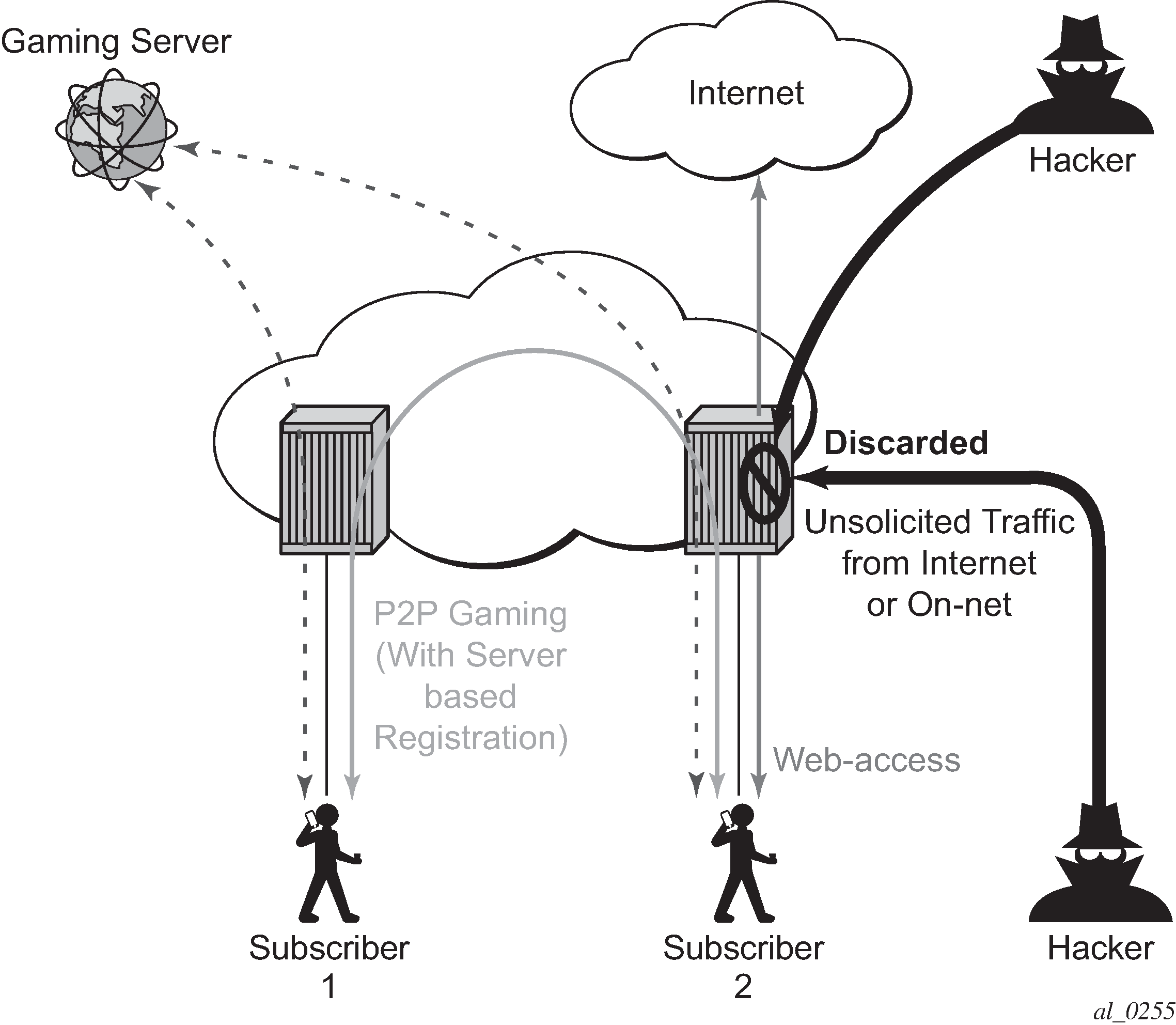 By performing stateful inspection, AA-ISA takes into account which side initiated a session and acts accordingly. Stateful flow processing and inspection uses IP layer 3 and layer 4 header information to build a state of the flow within AA-ISA. Layer 7 inspection is used to provide ALG support. Stateful flow and session processing takes note of the originator of the session and therefore can allow traffic to be initiated from the subscriber, while denying (when configured) traffic originating from the network. Packets received from the network are inspected against the session filter and only those that are part of a subscriber-initiated session are allowed.