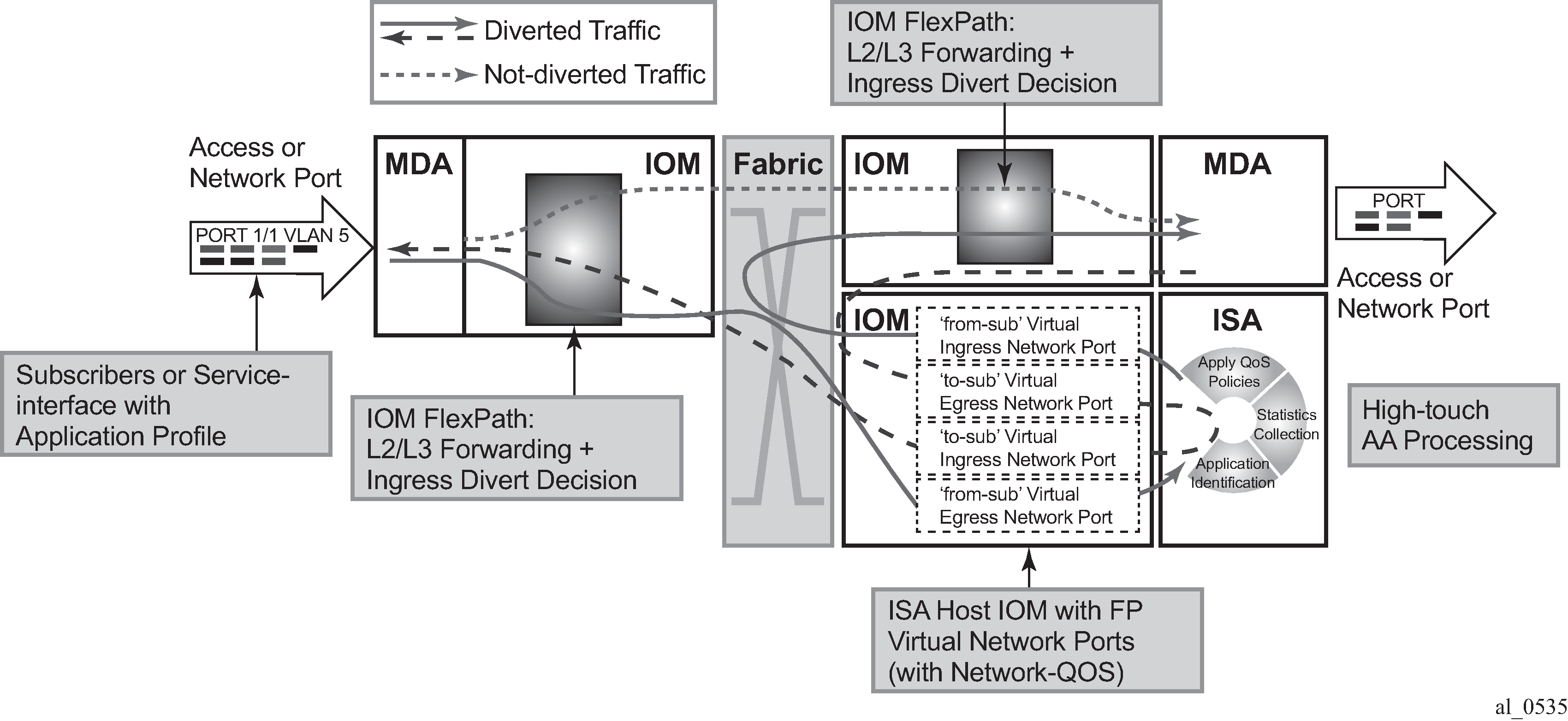As shown in System packet datapath to AA ISA, traffic is diverted to an AA ISA by provisioning of an application profile (app-profile) for a subscriber or SAP service context. SR OS then automatically handles traffic diversion for both directions of traffic for that AA subscriber context, through one of the AA ISAs in the AA group where that app-profile is defined.