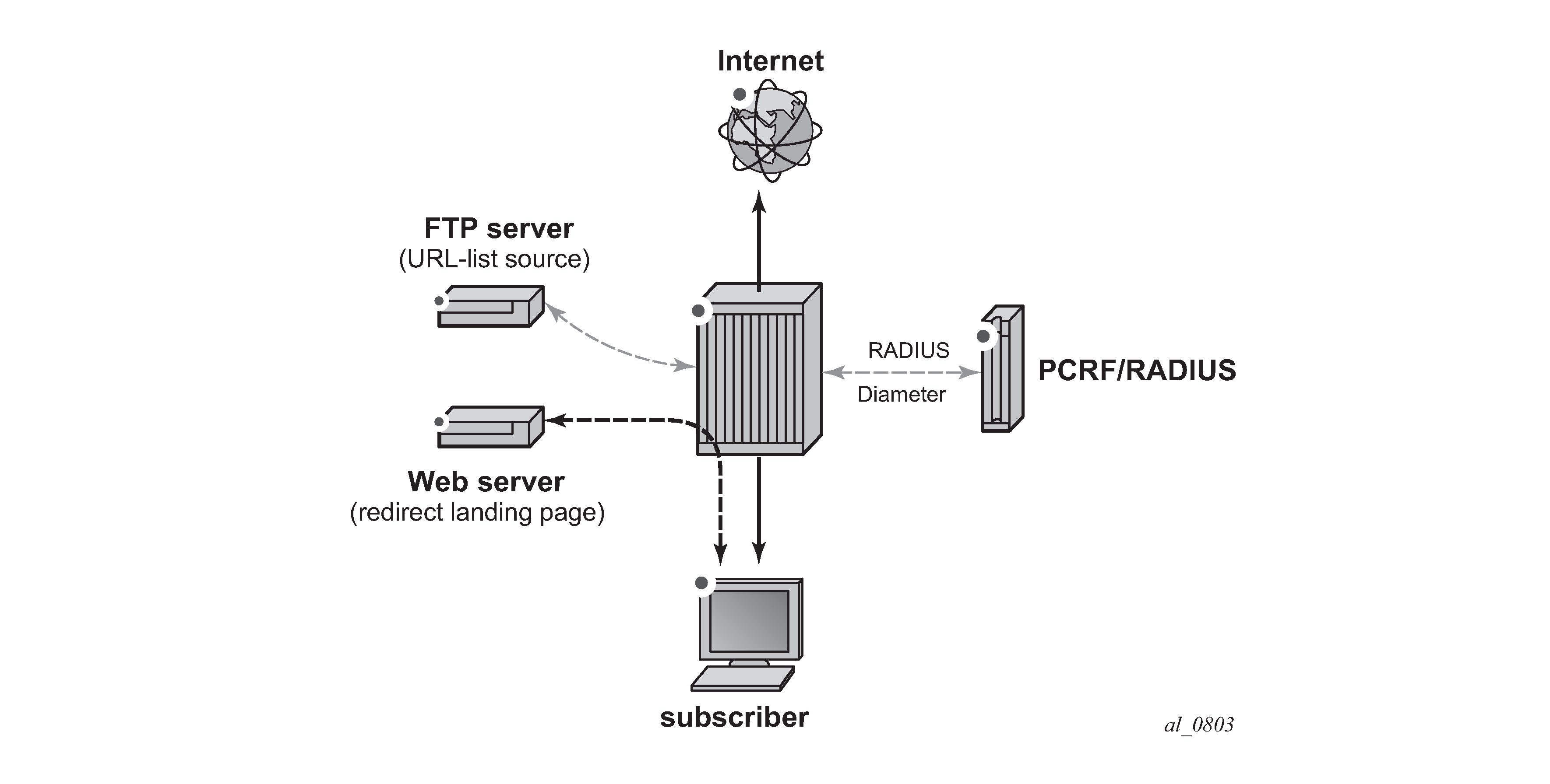 The SR OS uses the Application Assurance capabilities to extract the URL from a subscriber HTTP/HTTPS request and compare it to the list of URLs contained in the local file. If a match occurs, the subscriber request is redirected to a preconfigured web server landing page, typically describing why the access to this resource was denied.