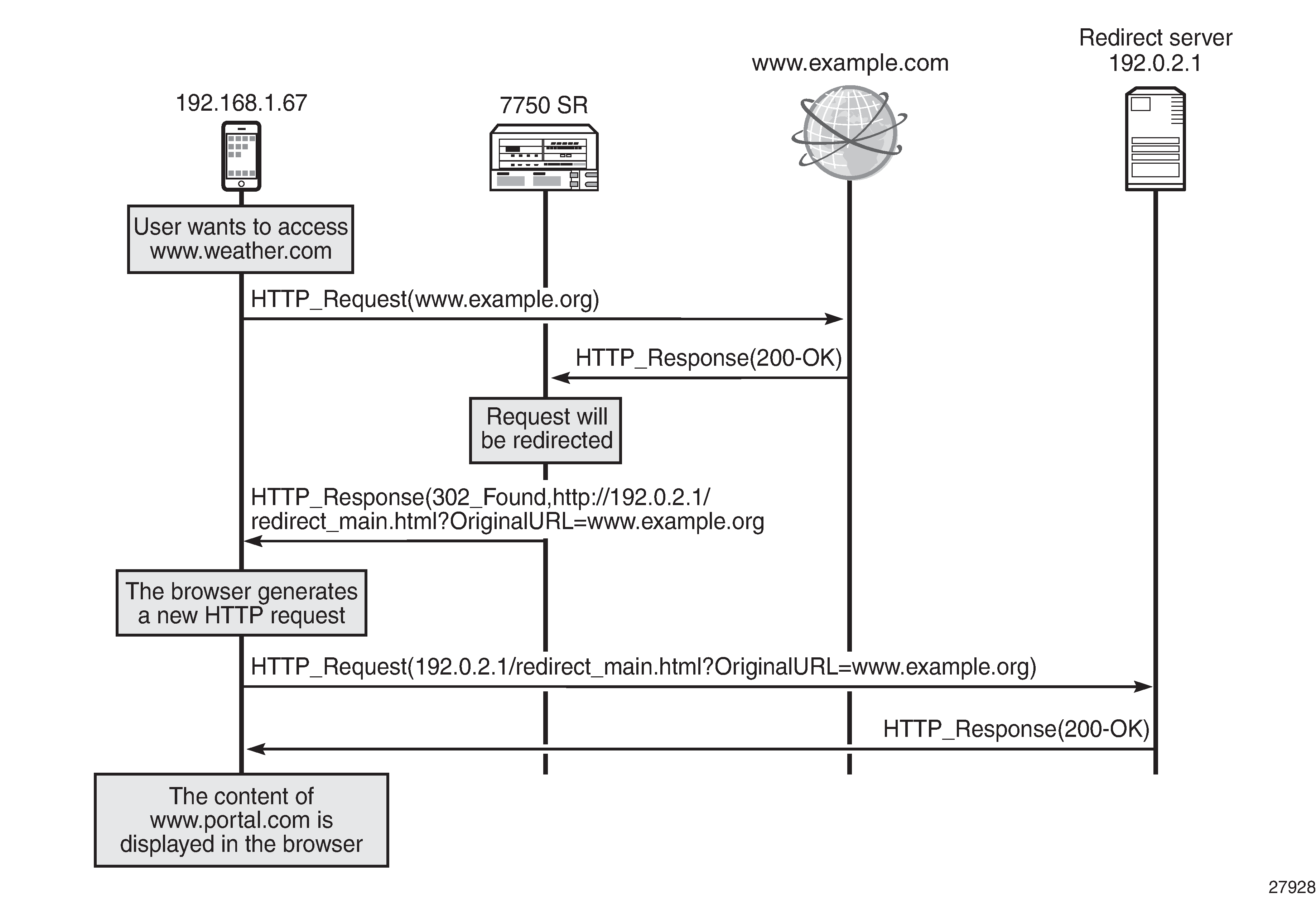 Hypertext Transfer Protocol HTTP/1.1 302 Found\r\n Location: http://192.0.2.1/redirect_main.html?OriginalURL=www.example.org/\r\n … … …The HTTP response status code "302" indicates that the web browser should generate a new HTTP request.